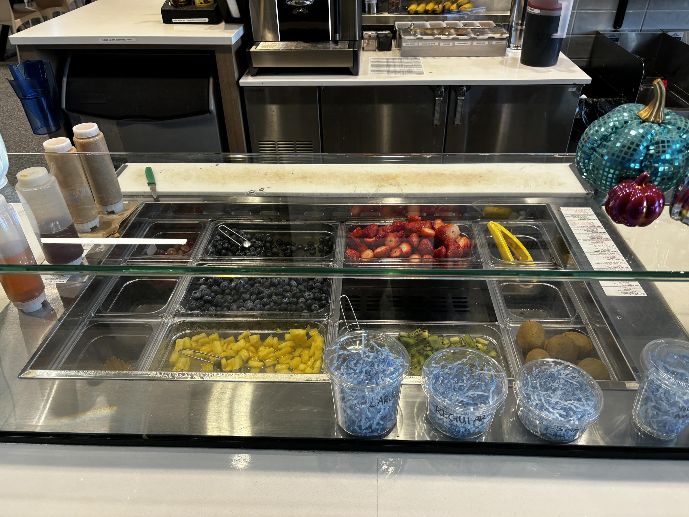 We ordered three bowls and watched as the woman behind the counter started slicing up our toppings. Two strawberries here, half a banana there, some pineapple and kiwi, with granola on top. Nothing that screamed "fresh" or "premium."