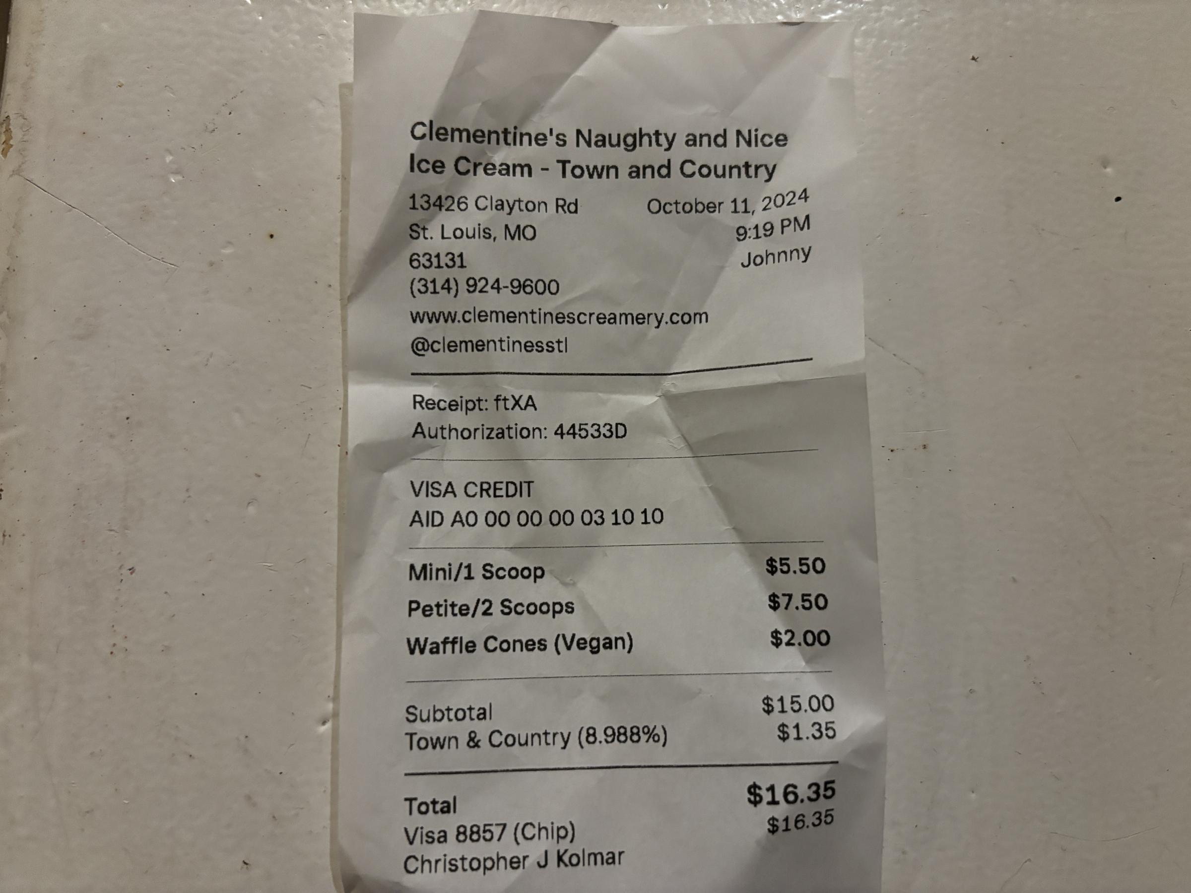 Clementine's Naughty & Nice Ice Cream Takeaway. Naughty = Expensive, Nice = Delicious. Clementine's may cost an arm and a leg for ice cream, but damn is it good. 9.2 / 10 ice cream, it's the real deal. I got an espresso royale with flakes of espresso. My wife had a midnight cherry bite in a waffle cone. At $5.50 for a scoop and $2 for a waffle cone, ice cream for two cost us $16. They have a ton of custom flavors, including chocolate bourbon and champagne. Real deal ice cream experience.