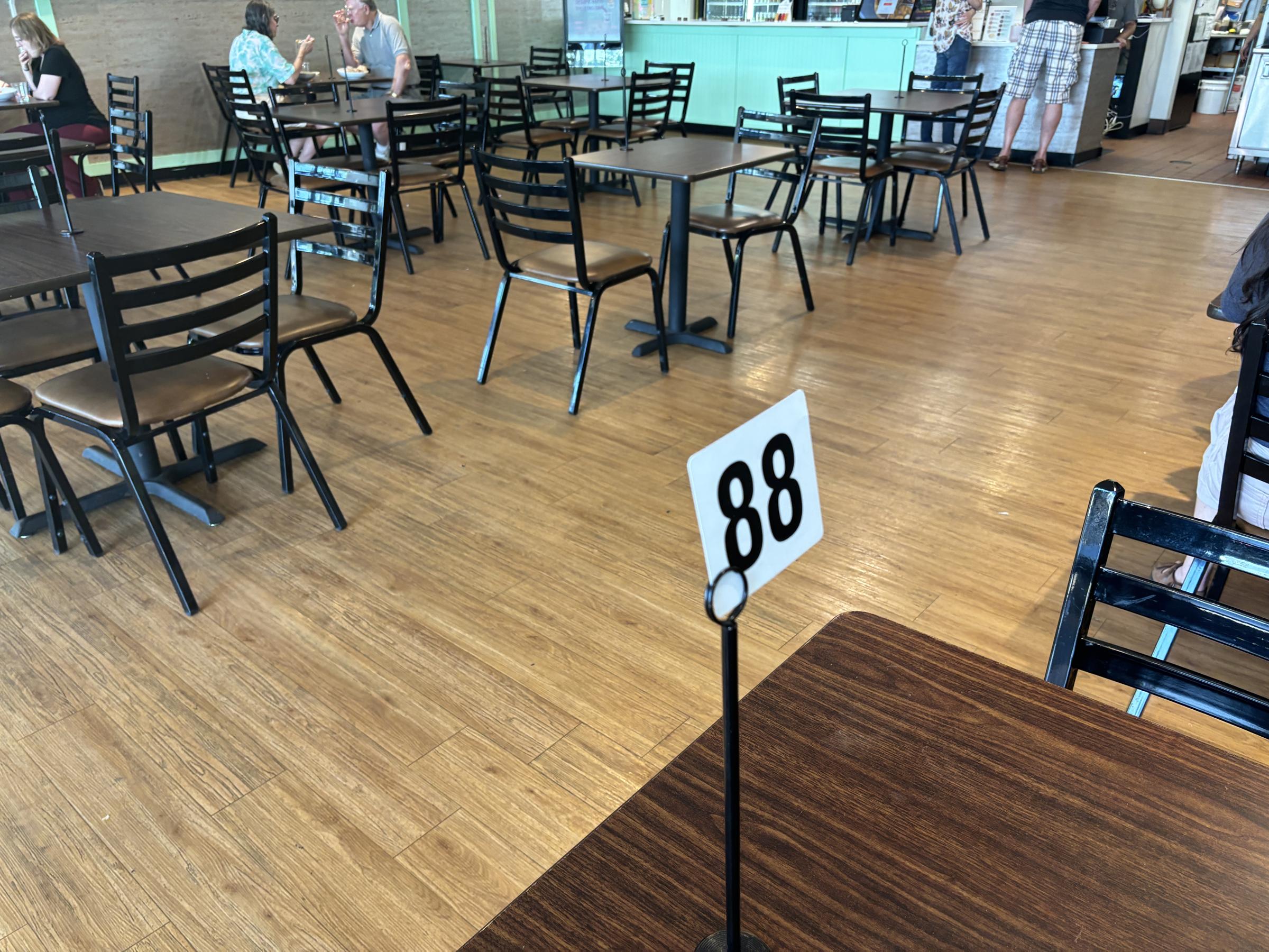 After placing your order upfront, they will give you a number, and you will pick a table. The food came out in ten minutes from a super-friendly server. In the meantime, we picked up water, napkins, and condiments from a table next to the counter.