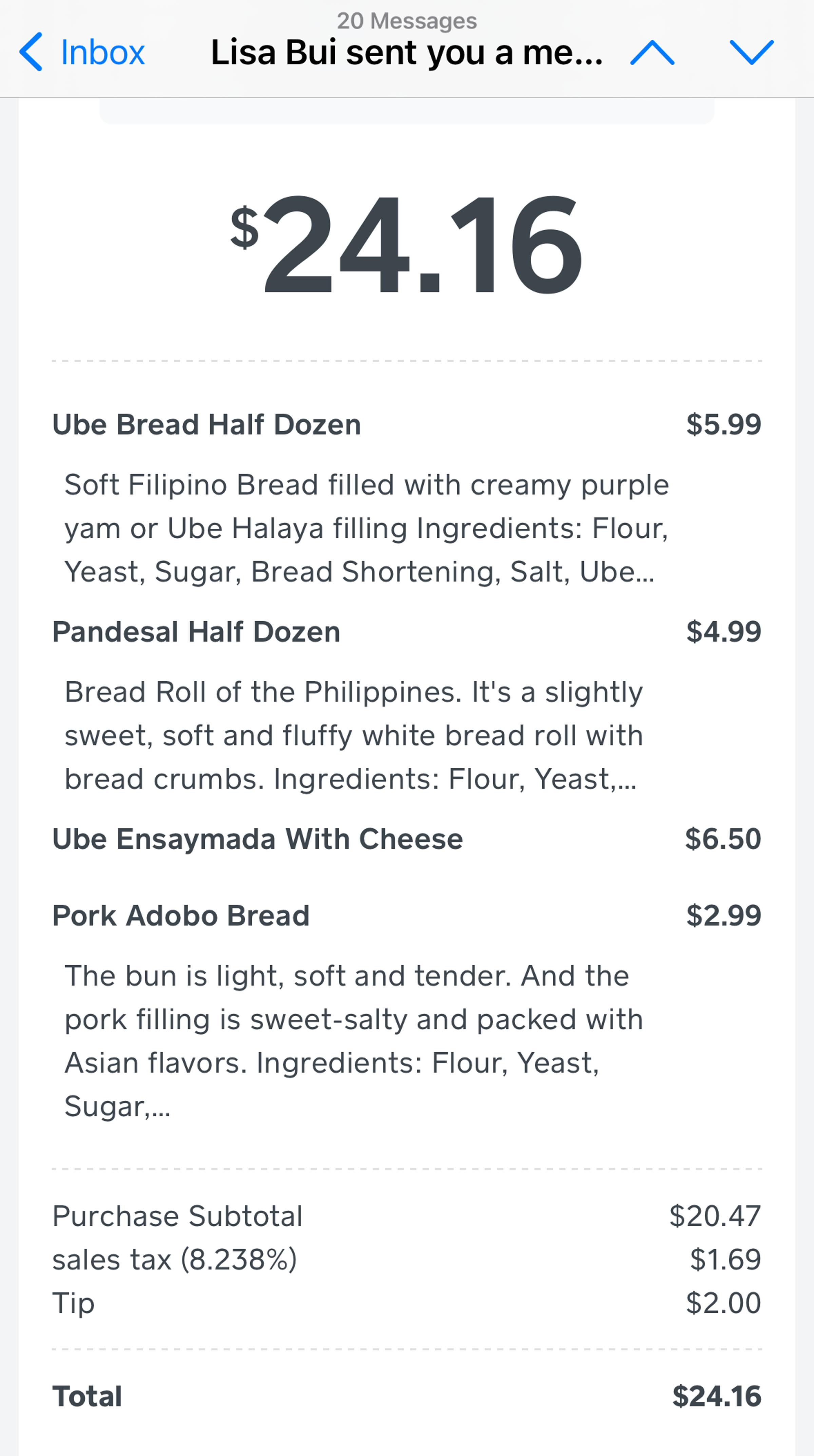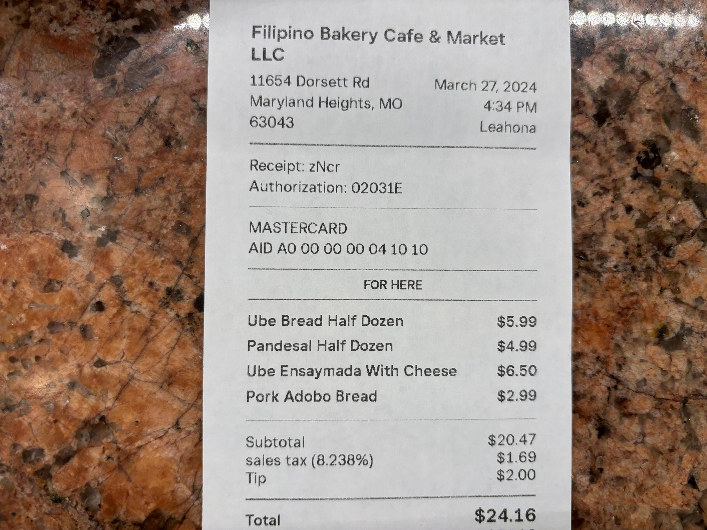 Filipino Bakery Cafe & Market Takeaway. Buns That Are Breads And Other Fun Stuff. Ube bread was a 6.9 / 10 bun for me. They sell in a six-pack of ube bread for $5.99, directly inline on a per oz basis with other buns in the area. You need to warm it up at home to get the full flavor. I highly recommend the oven over the microwave. Adobo pork bread is worth having once to experience the flavor. Unfortunately, it is not my favorite bakery in an area with better options very close by.