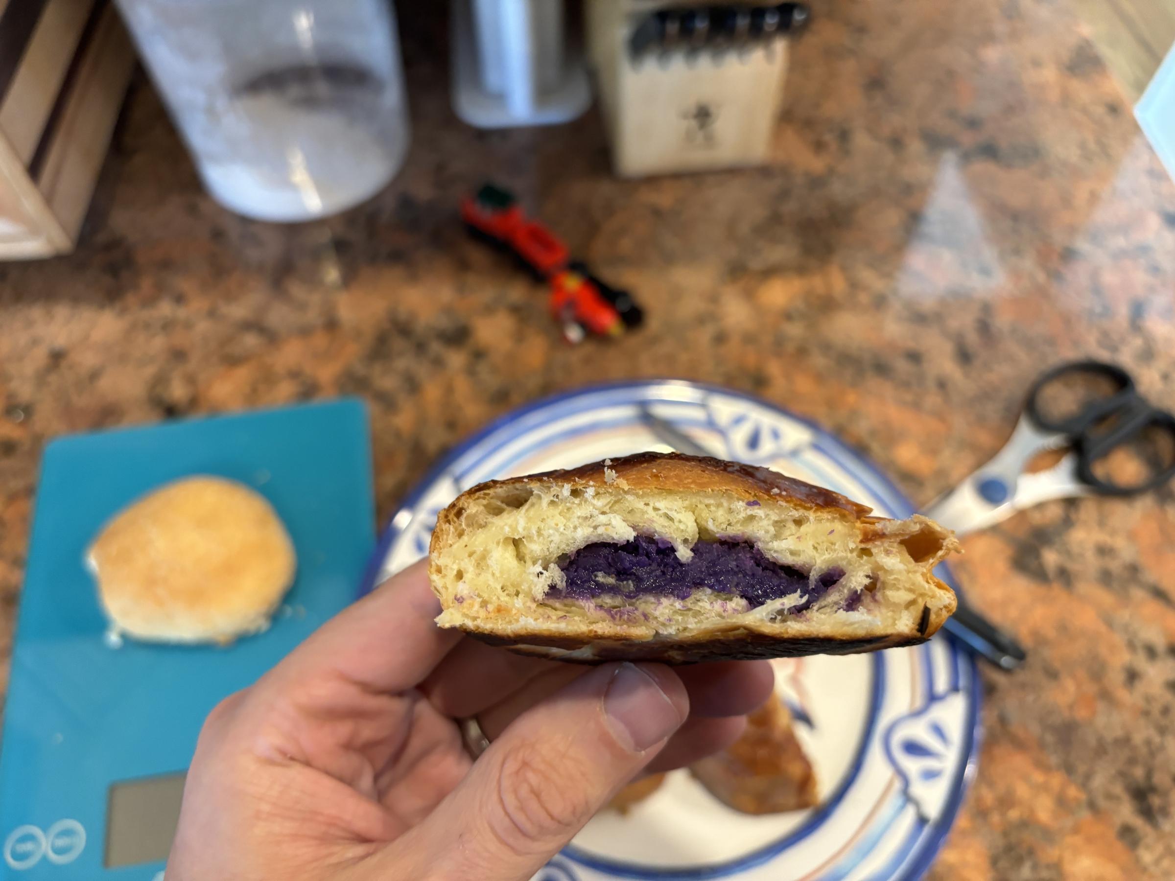 To put a bow on this Ube bread, it is good but not great, and there's just better stuff very close by on this front. The Ube filling is the strongest part of the bun. It has a slight taro-y sweetness that gives it more of a potato-y mouthfeel. The texture and flavor are correct; there's just not enough of the flavor.