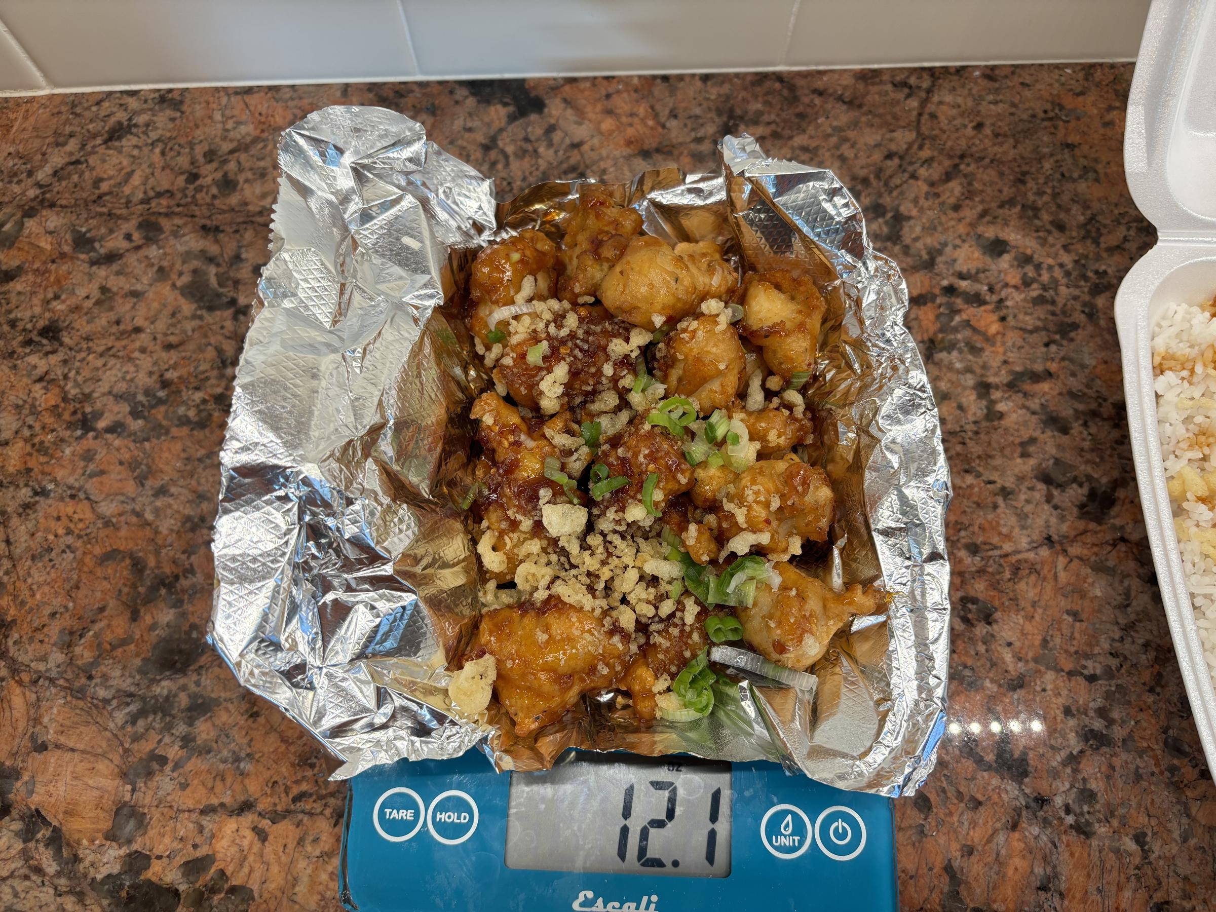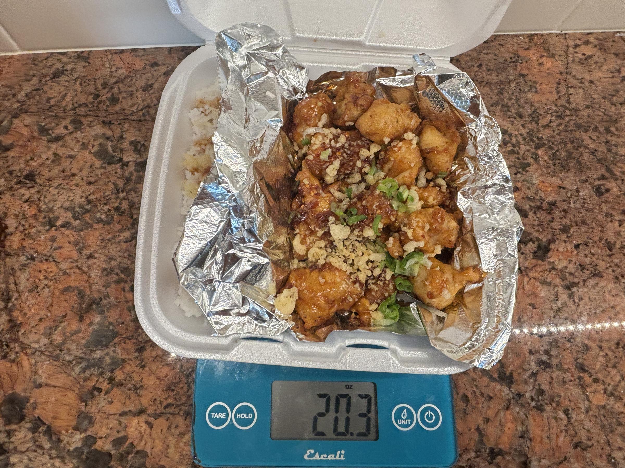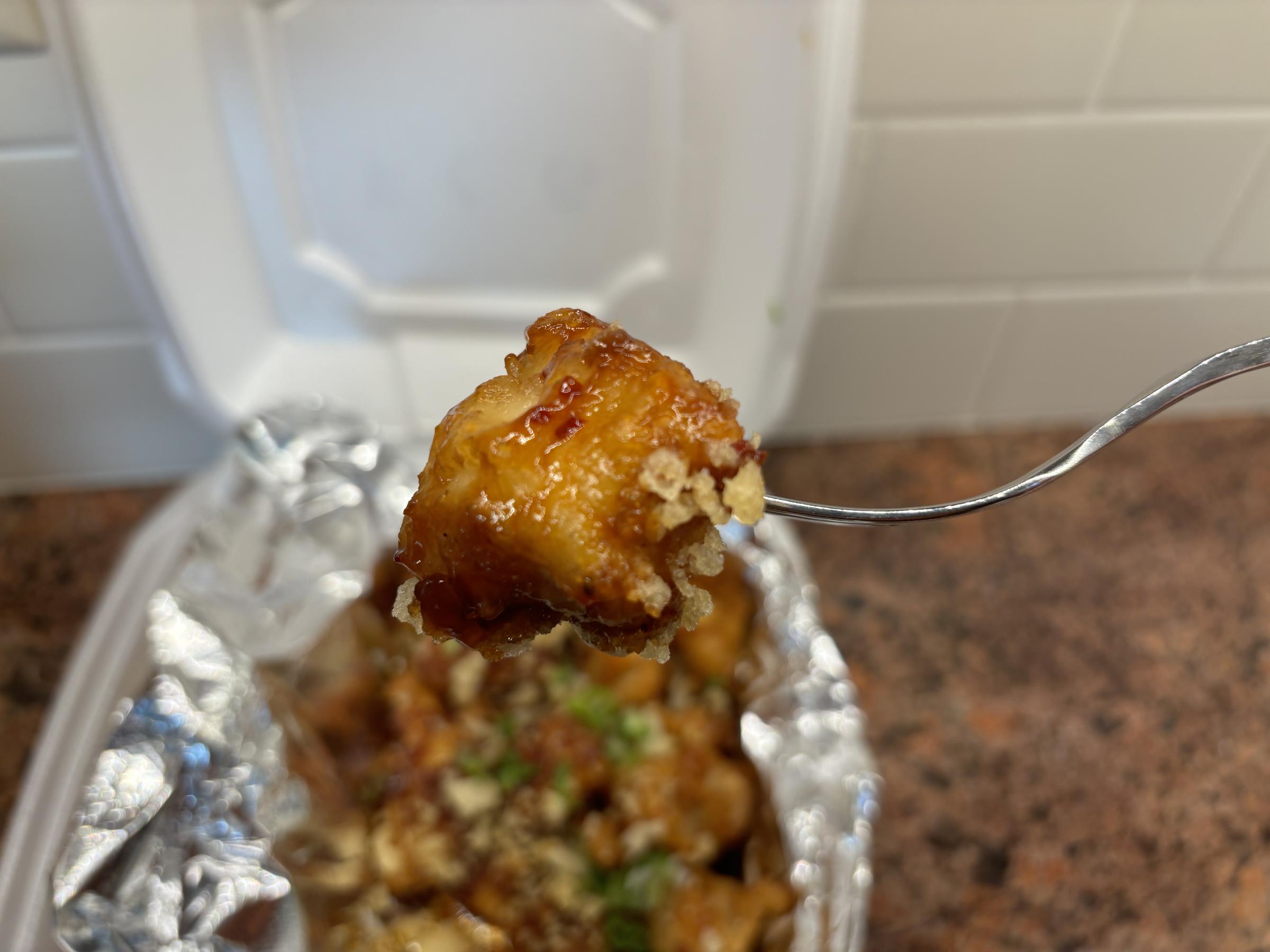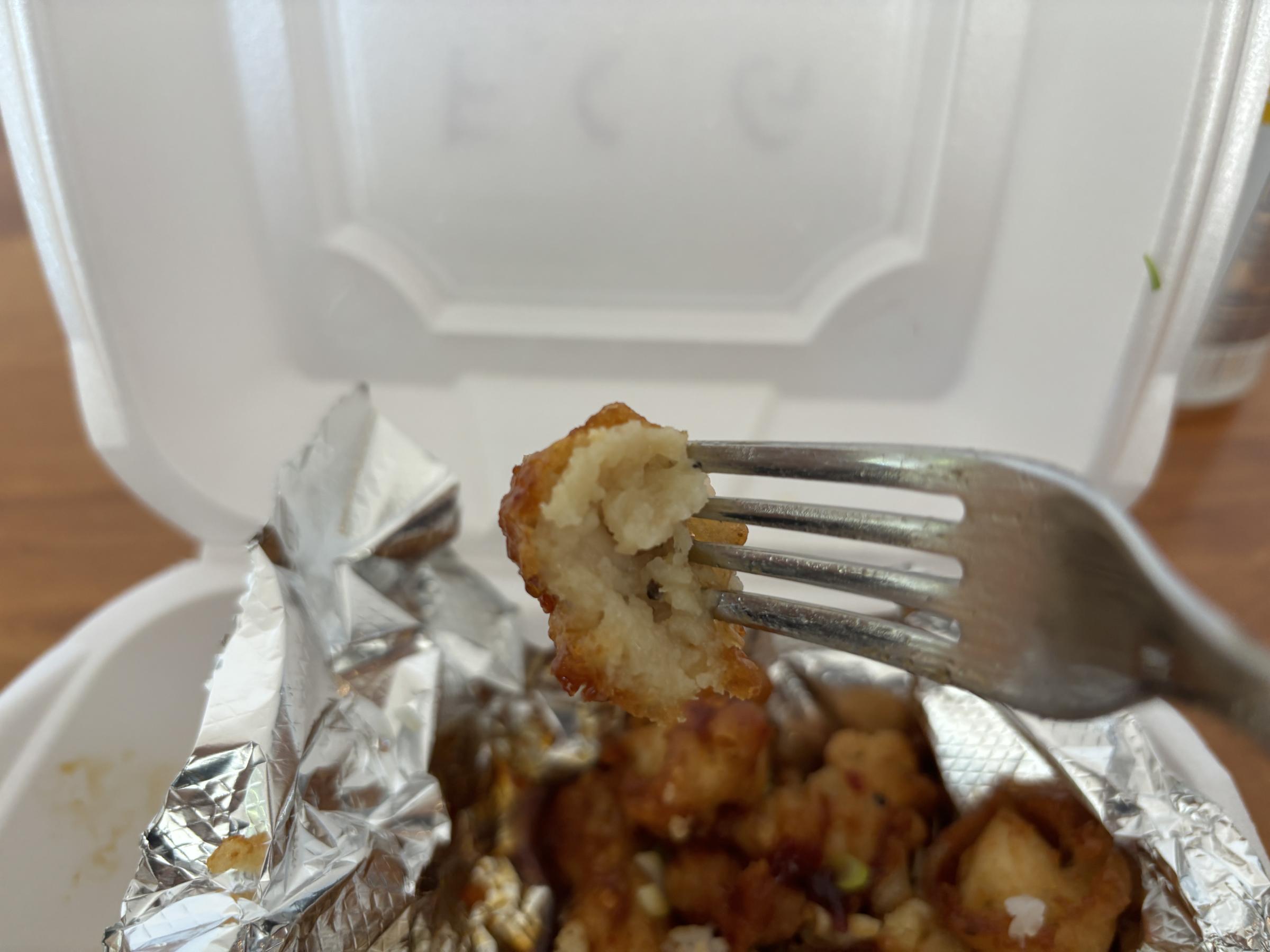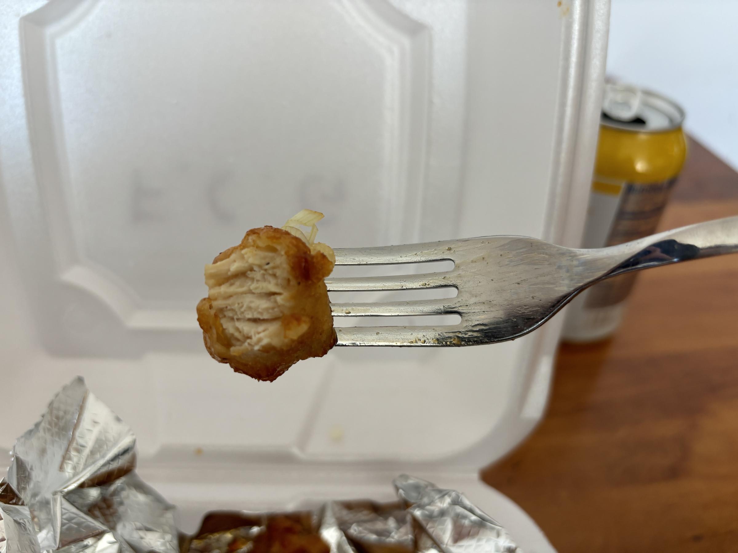 I thoroughly enjoy this meal. I give the chicken a very, very solid 8.4 / 10. That's some high-quality chicken. It's coating is light and fluffy, with a nice crunch. It doesn't ooze oil when you bite it and the chicken is juicy and tender.