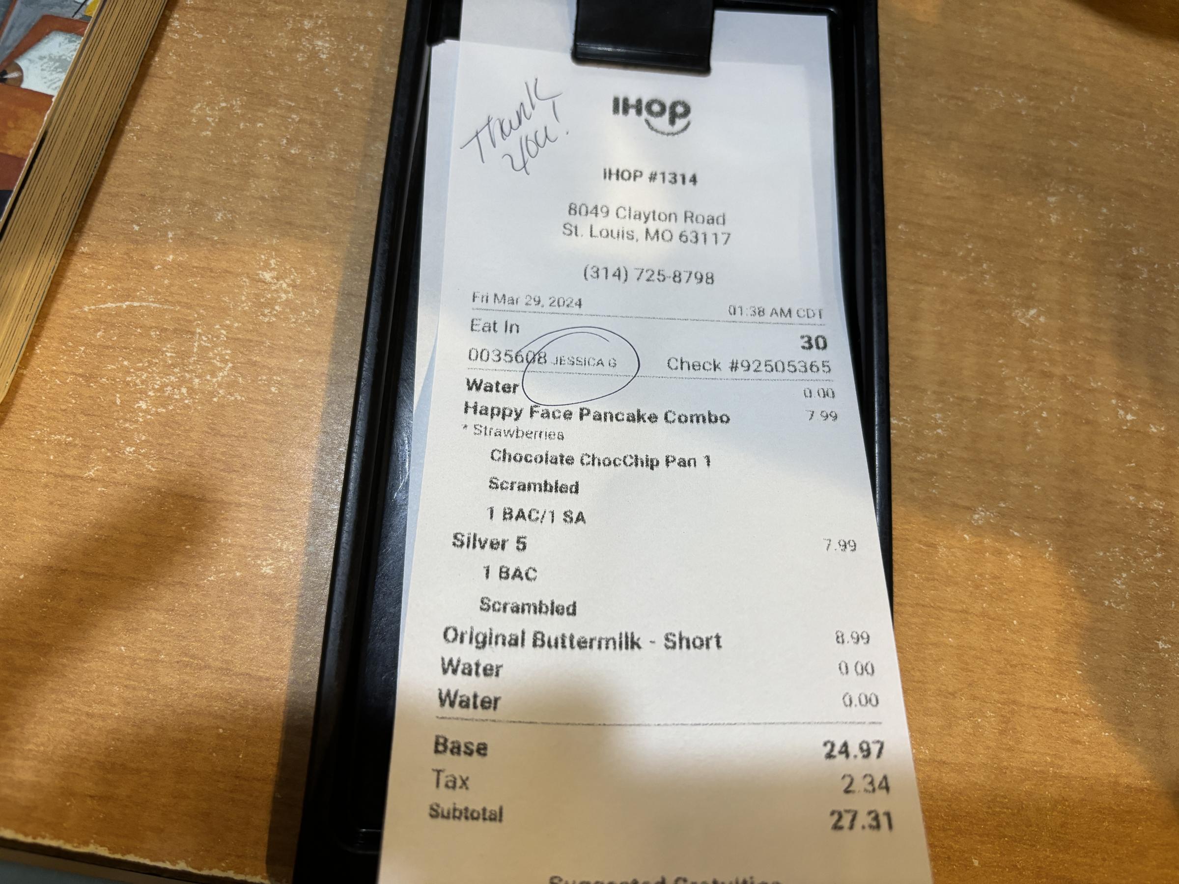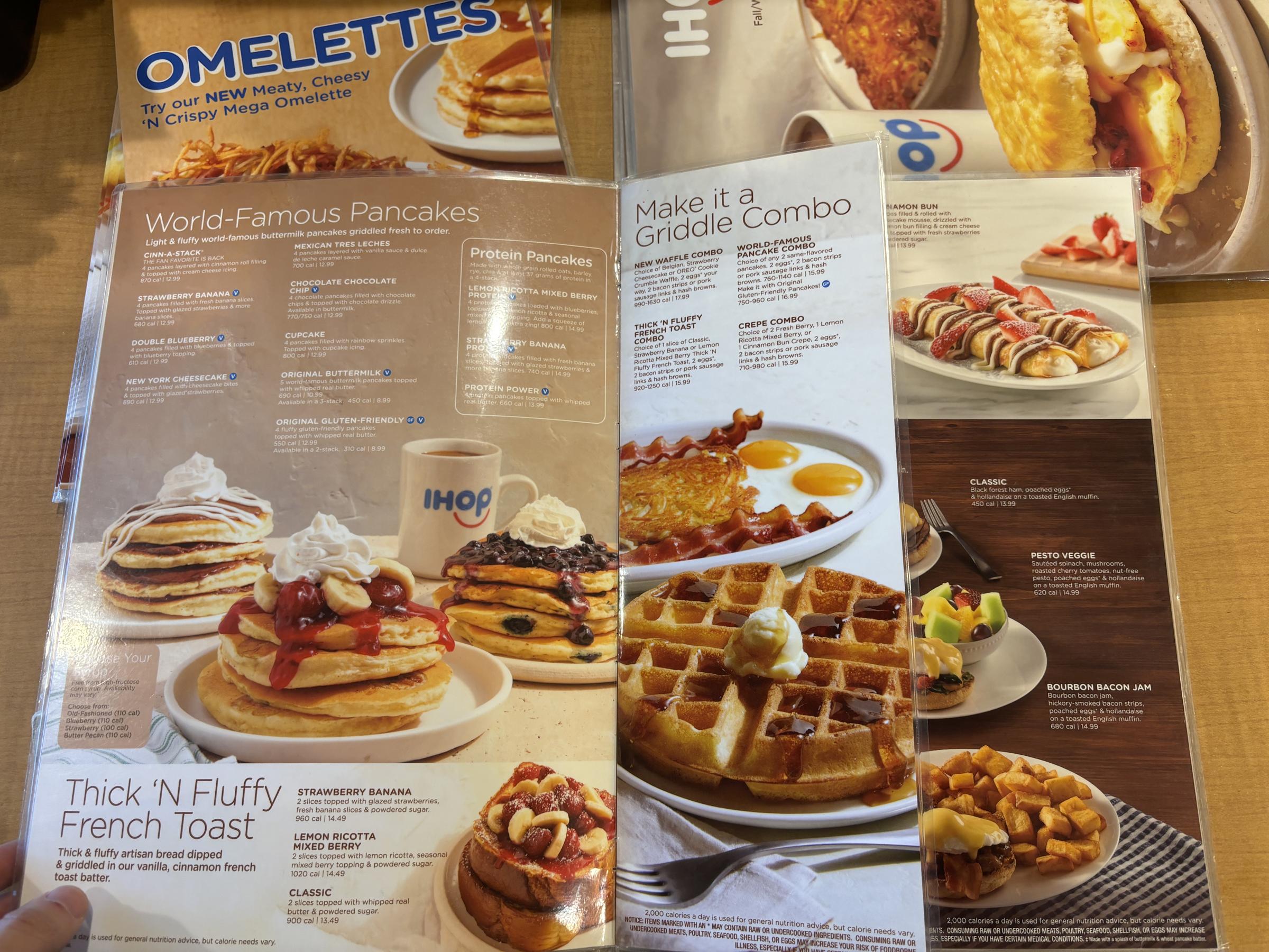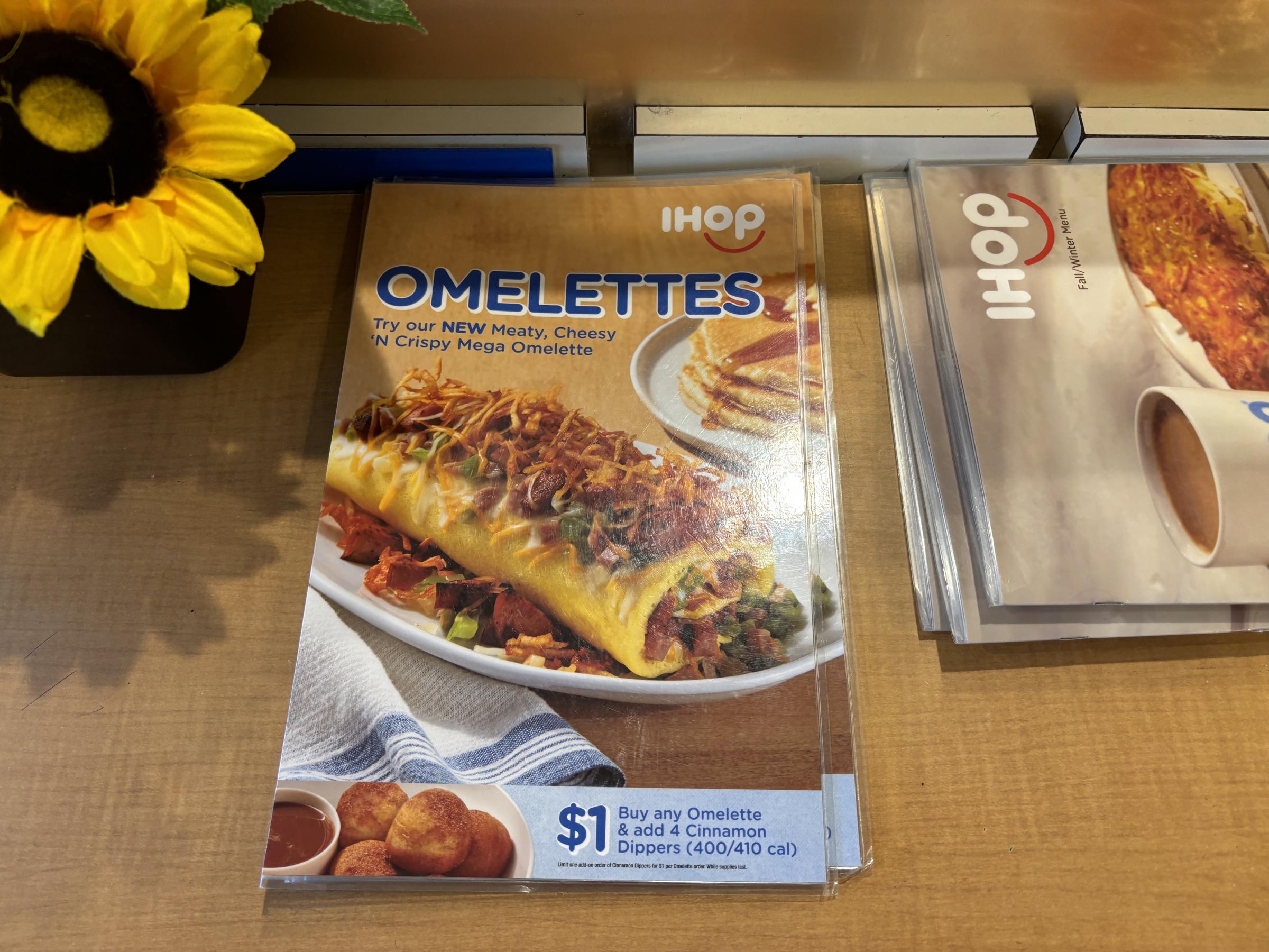 Man, the first thing I noticed when I sat down at IHOP was that this place got expensive. I don't remember when or why it got this expensive, but a five-stack of pancakes costs $10.99, and a kid's meal costs $7.99.