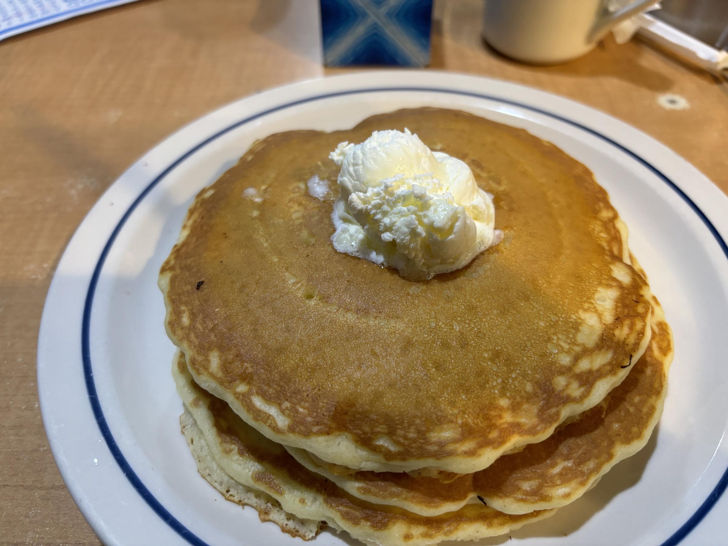 The pancakes are, you know, a 5 / 10. They used to be cheaper but feel far too expensive now for the value. They have a solid thickness but with sweetness and chewiness. They taste like they always have; the ingredients must just cost more. At $10.99 for pancakes, it seems a bit much.