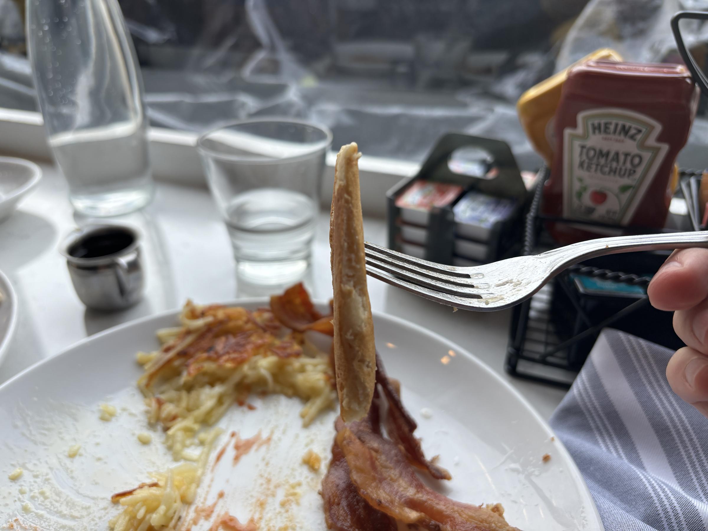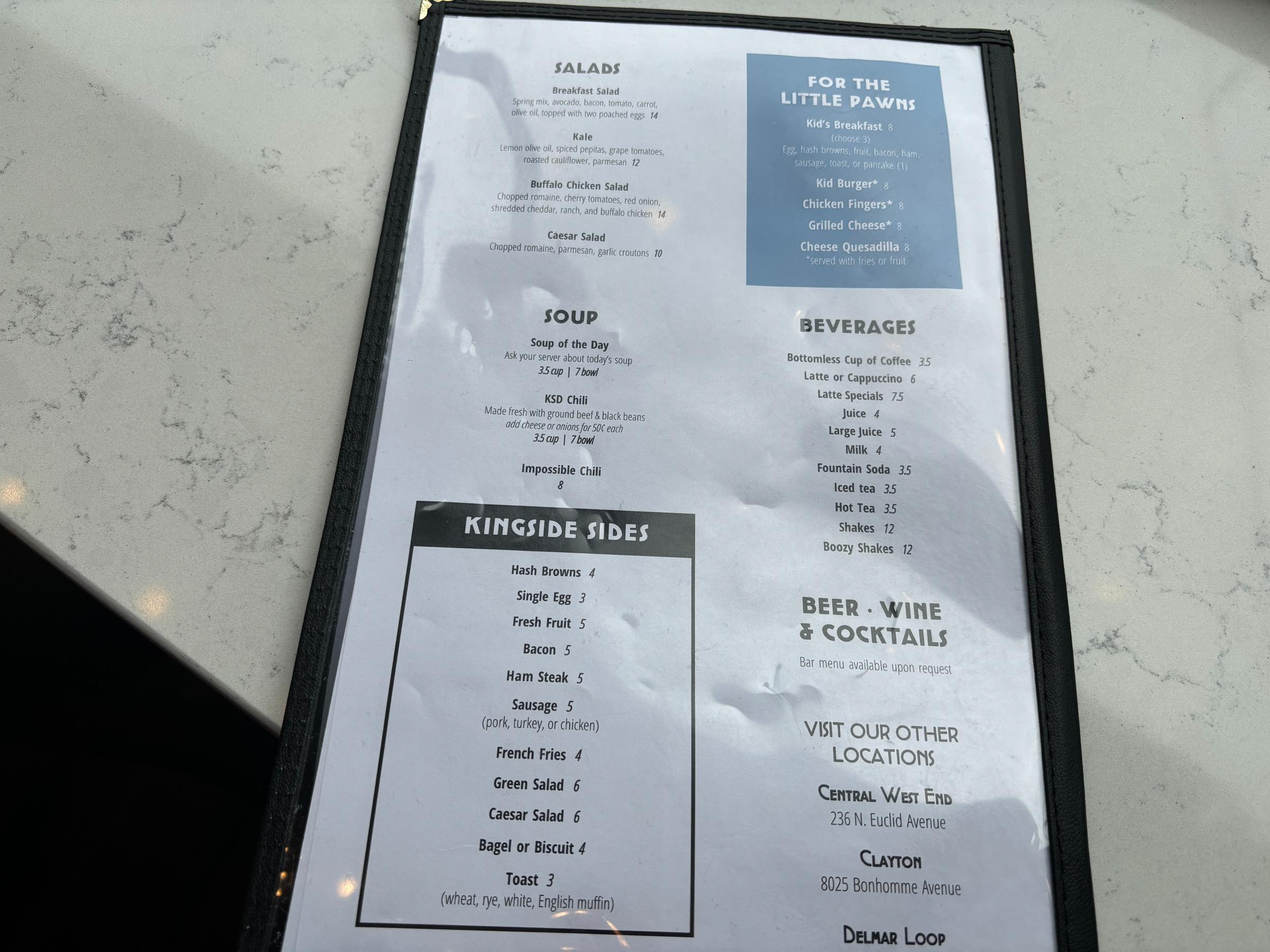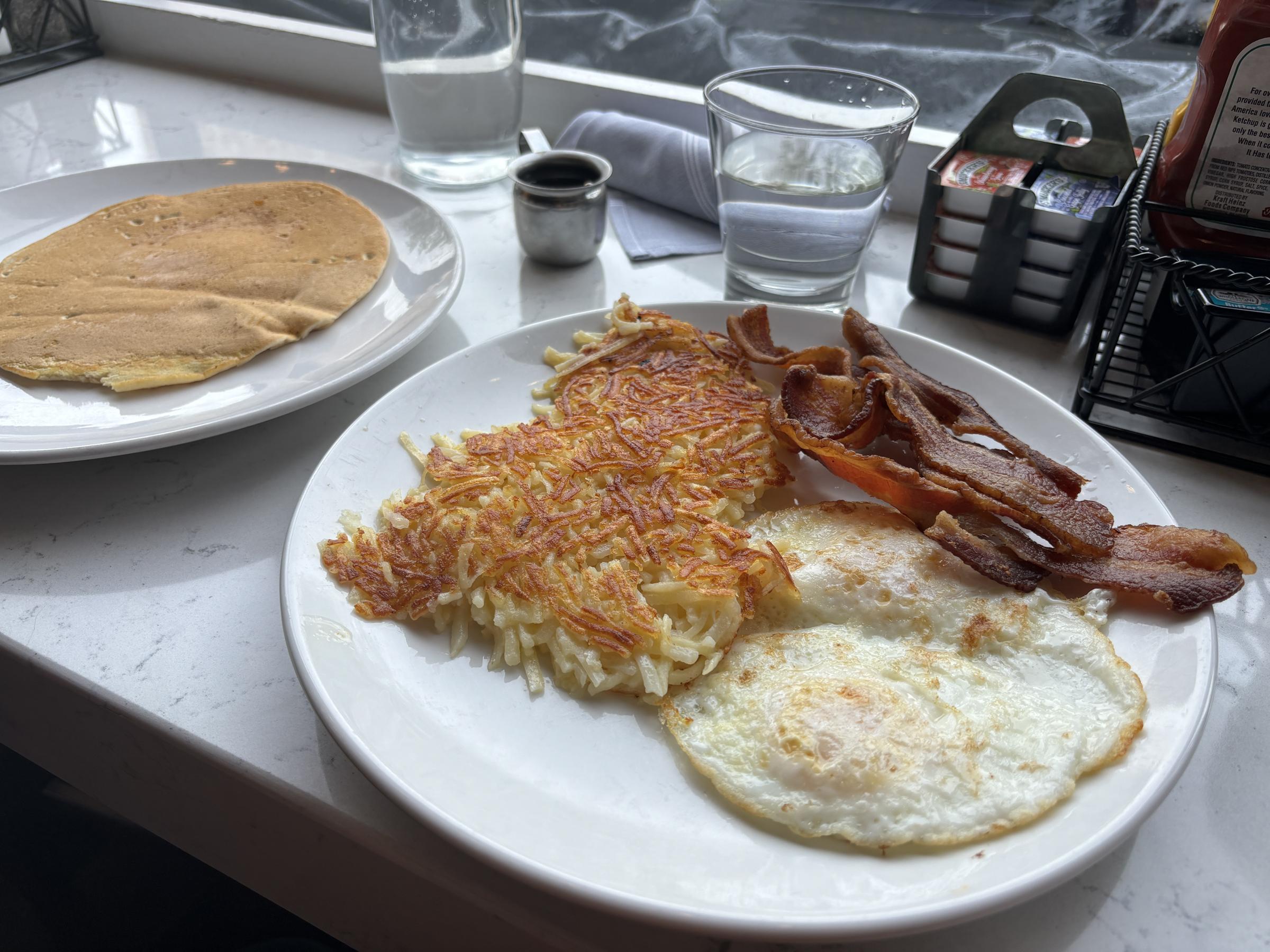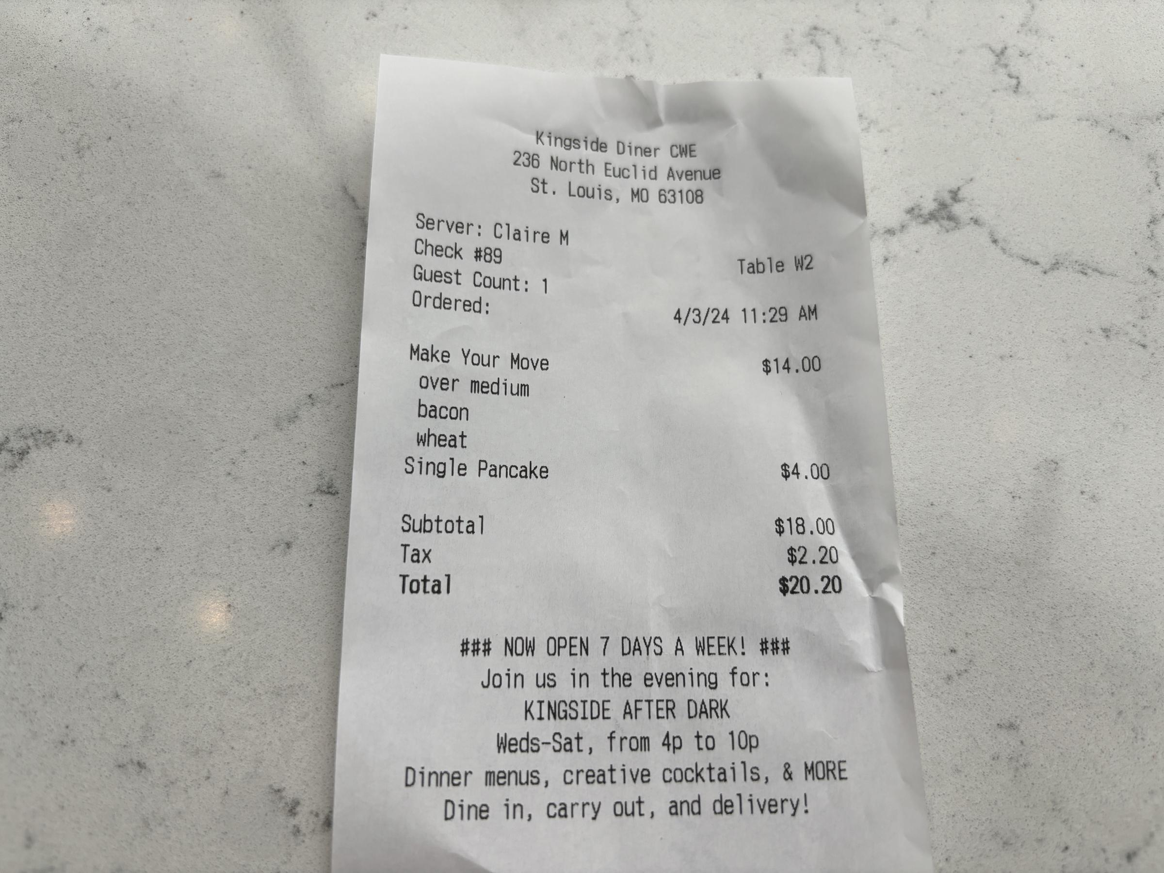 Kingside Diner Takeaway. A high-stakes breakfast that's more straight than flush. The Standard Breakfast earns a respectable 7.8 / 10 on taste but is quite pricey. $13 for eggs, toast, and hashbrowns because it's in the Central West End. The hashbrown anchored the plate. I got a side of bacon, which was top-notch. The pancakes disappointed, earning a 4.5 / 10 pancake score.