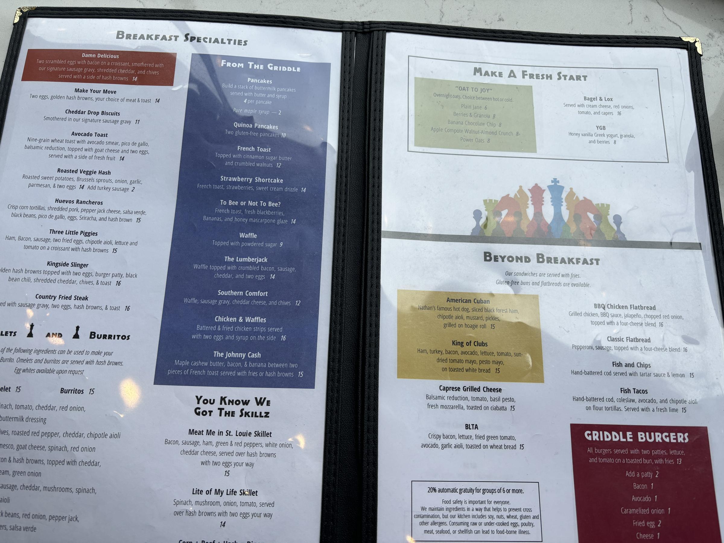 I went with what they call the Make Your Move, chess pun intended. The closest thing I could find to my Standard Breakfast, except this version comes with bacon. Even though the math shows that my Standard Breakfast ($13) would have been $1 cheaper, I splurged for the bacon.