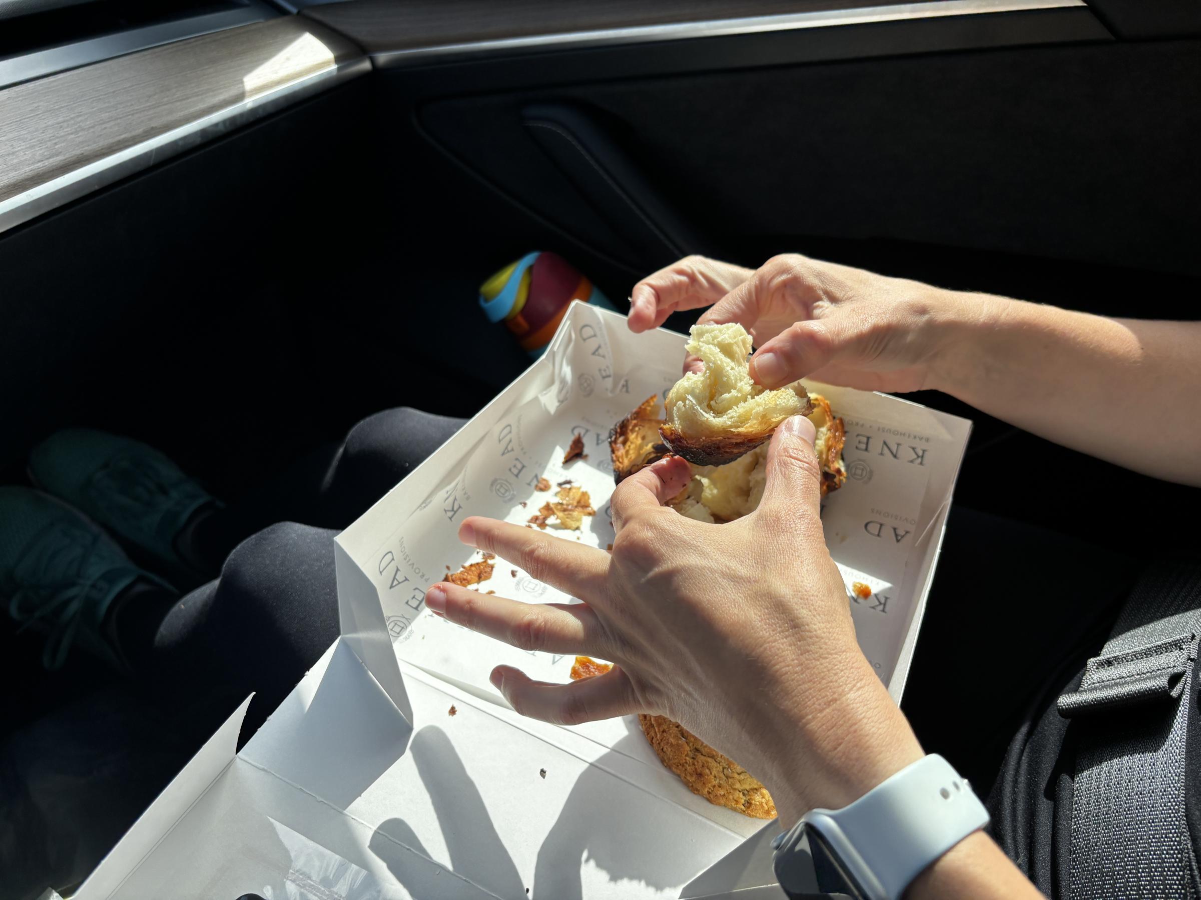 That kouign-amann is pastry perfection, a 9.9/10. If that one's a 9.9, this one from Knead is an 8.5. It was delicious, with a crunchy outside and a buttery, sweet inside, but it didn't have the distinct day-old, combined croissant surface area for the sugary syrup to get into.