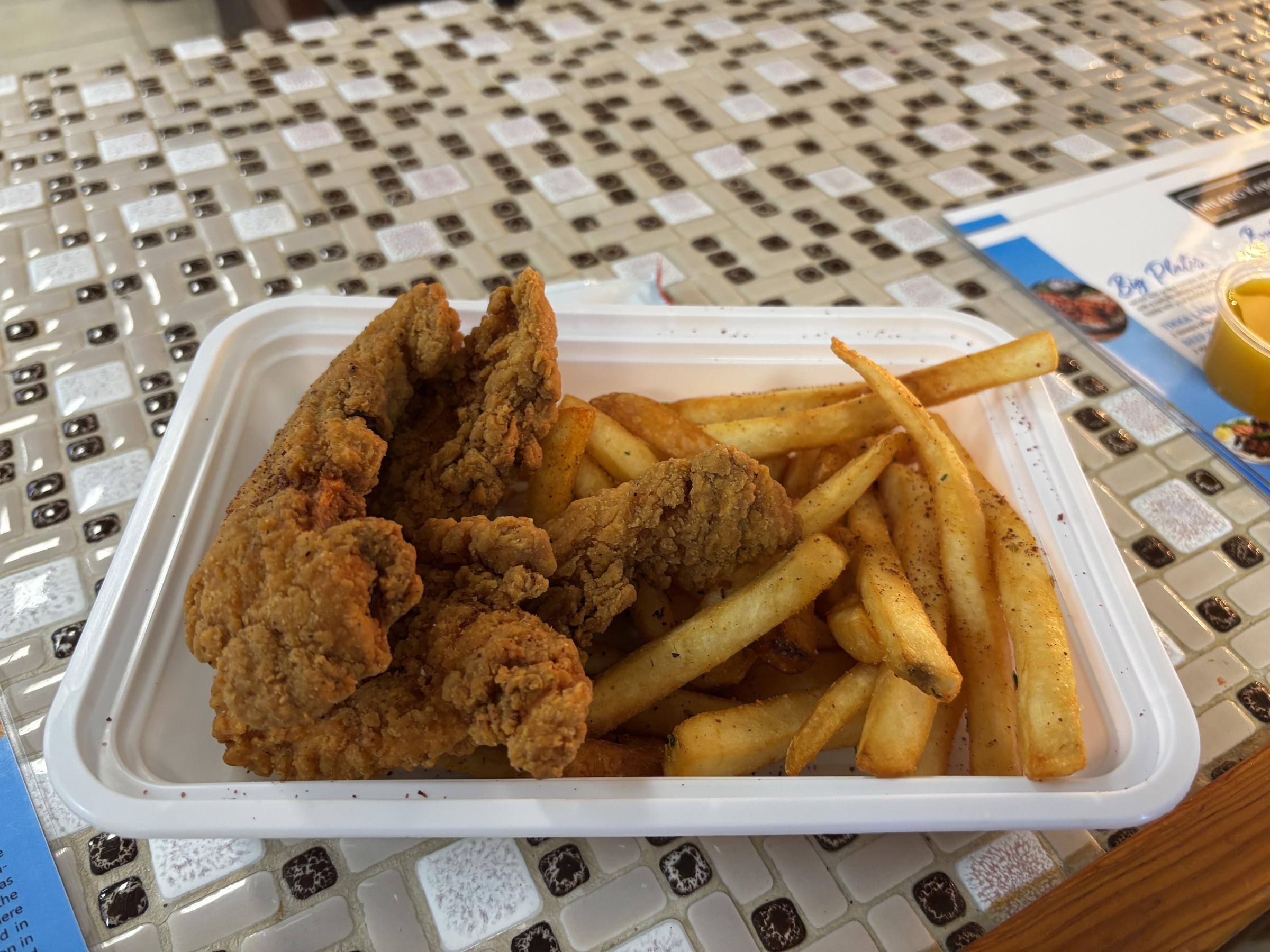 My kids got the chicken tenders and fries. The tenders tasted fresh, like they were coating themselves. The kids loved them. They were very good chicken tenders, 7.8 /10 on the chicken tender scale.