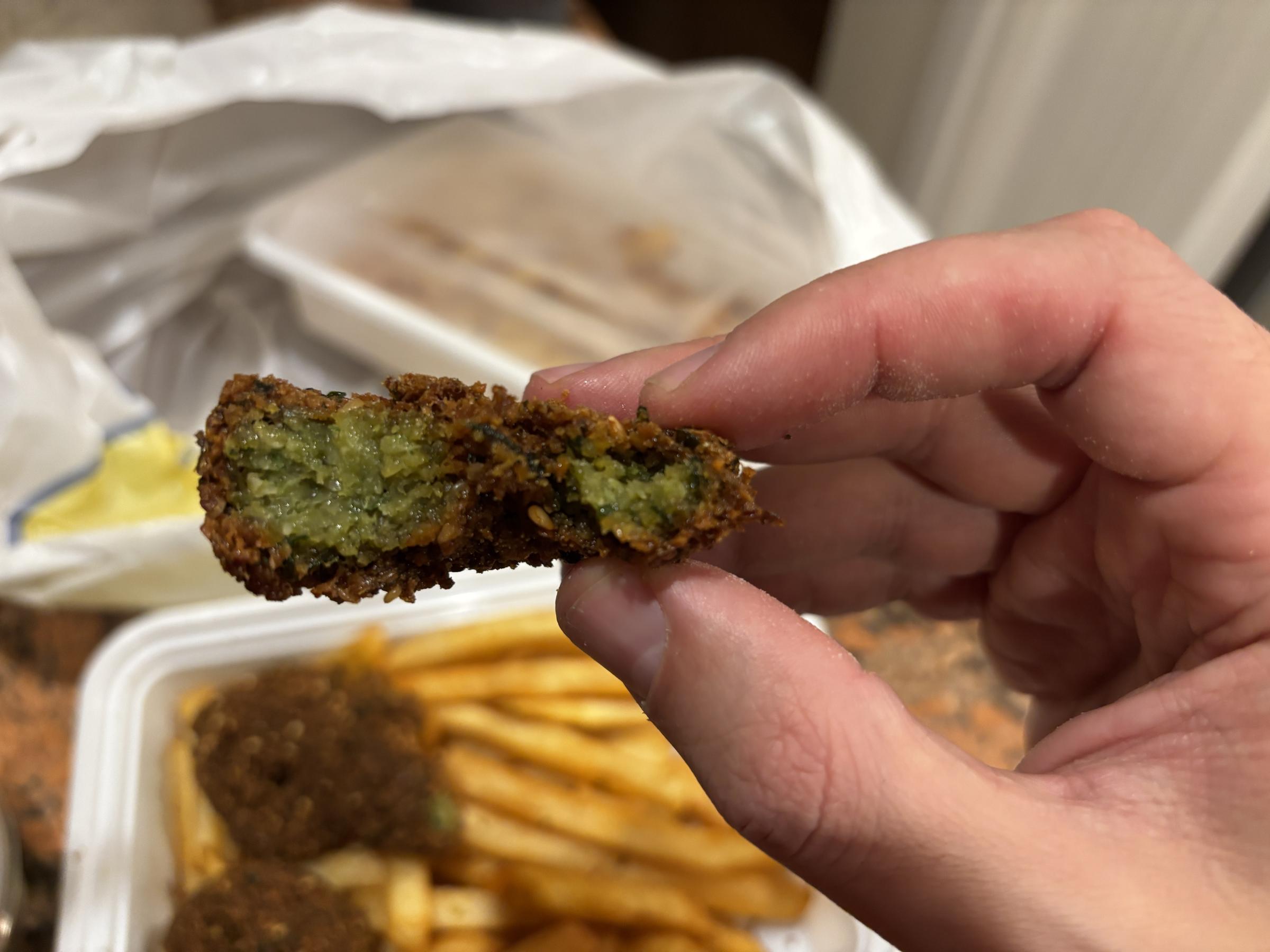 The falafel was the best I've had in St. Louis. Now, that's like an N of 5, but it was delicious. It's shaped like a donut with a hole in the middle.
