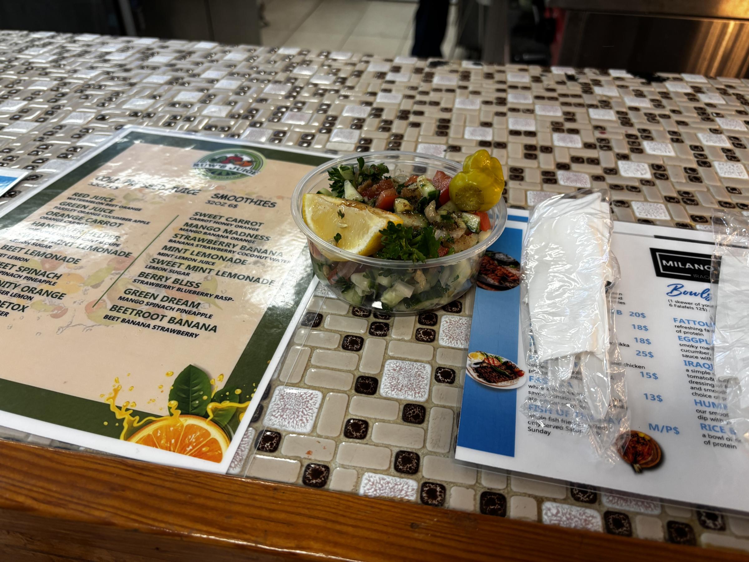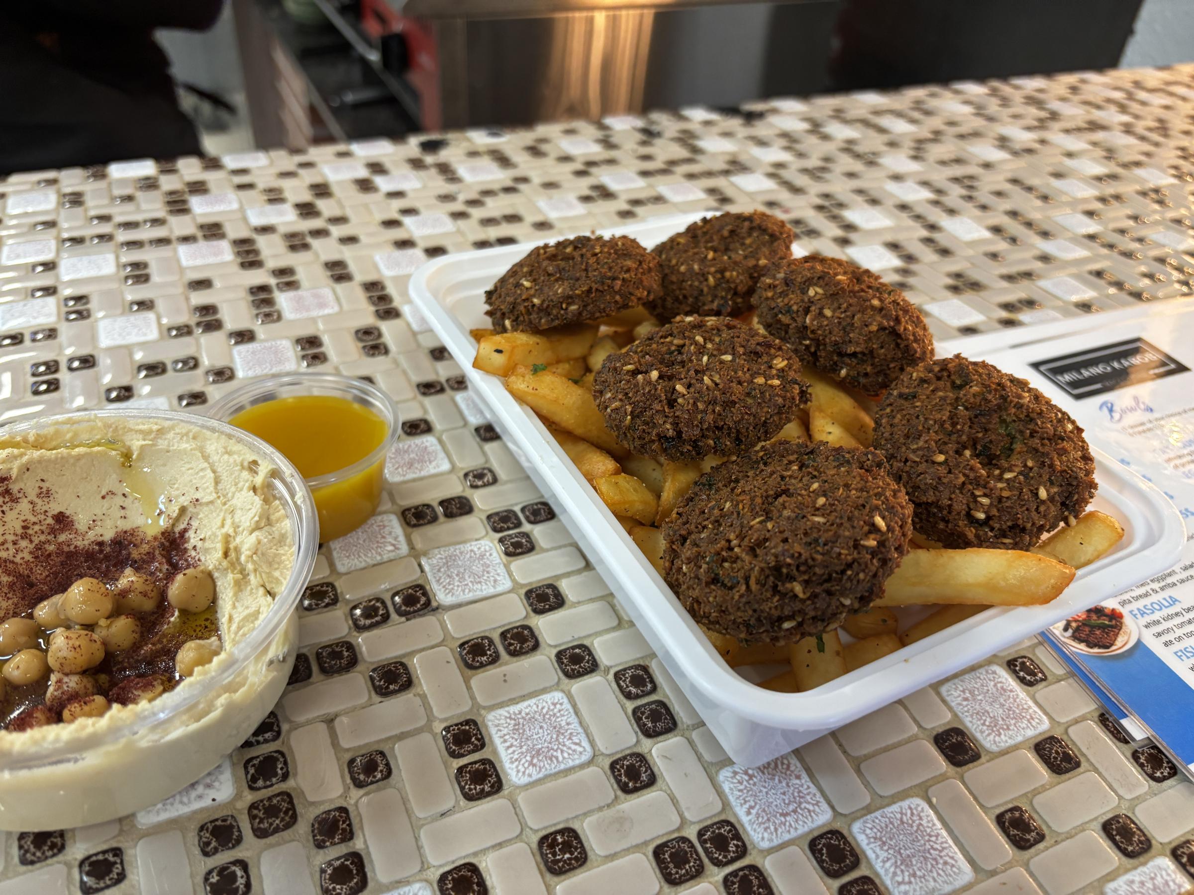Milano Kabob Takeaway. Falafel donuts are hole-y delicious. My favorite falafel in St. Louis. A new spot in the Loop where Al-Tarboush used to be located. 8.2 / 10 overall, led by 8.6 / 10 falafel and 9.0 / 10 garlic sauce. The falafel has a unique donut shape and I could quite literally drink the garlic sauce. The fatoush, sides, fries, and chicken tenders rate out at average restaurant quality of 7/10. I didn't get a kebob…