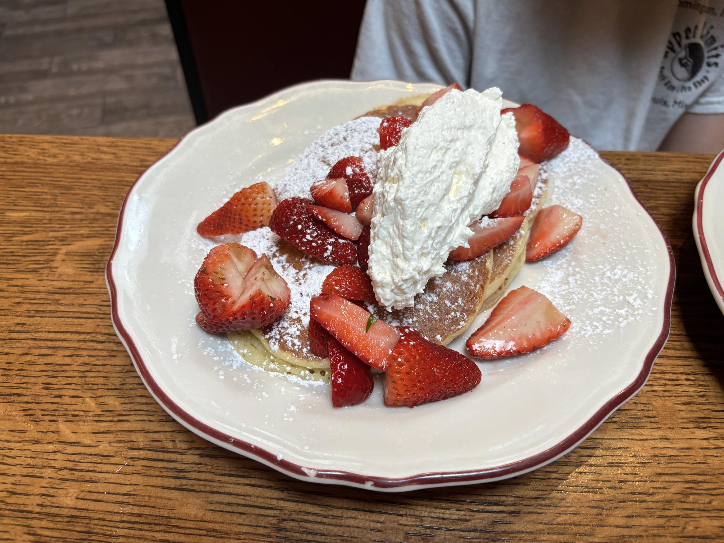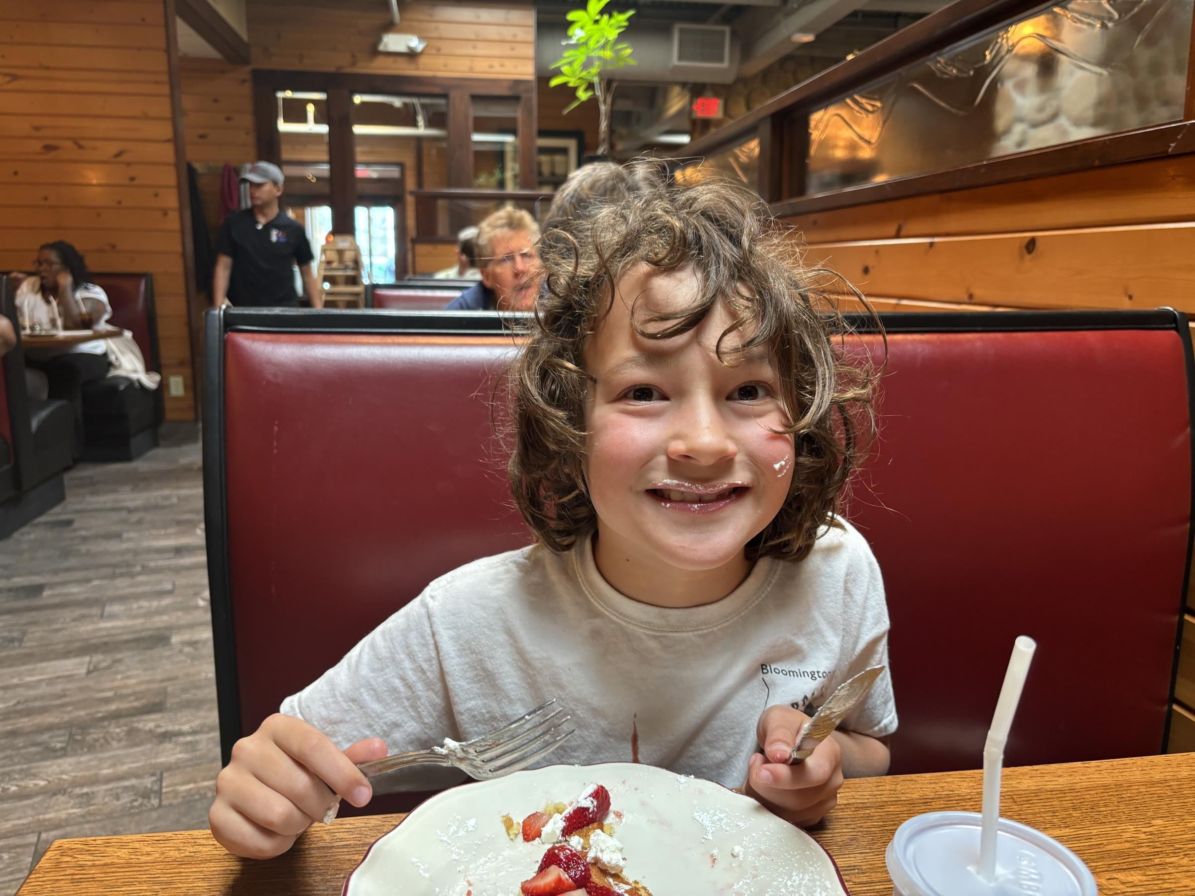 Topped with a ton of homemade whipped cream and paired with a side of strawberry syrup, he had as much on his face as in his mouth most of the time.