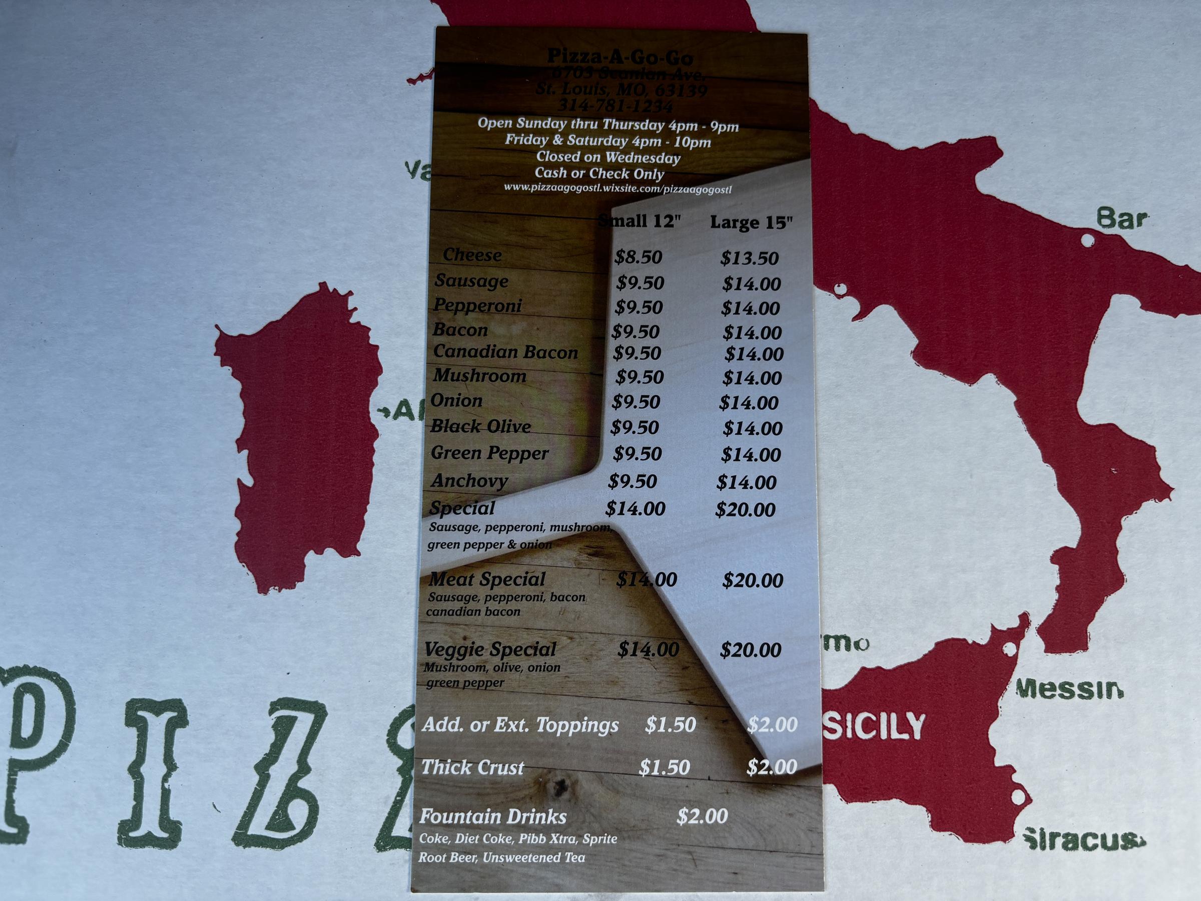 Pizza-A-Go-Go Takeaway. Wake me up before you go go grab a pizza at Pizza-A-Go-Go. A down-to-earth pizza joint in the Lindenwood Park Neighborhood. Surprisingly, solid pizza earns it a top-five ranking in St. Louis with an 8.0 / 10 pizza score. Deliciously crunchy crust with the appropriate ratio of cheese to sauce. You could taste a hint of oregano in each bite. However, there was a bit too much grease, and the crust lacked the fluffy chew you'd find in some of the better pizzas. At $13.50 for a 15", it's one of the more affordable items in St. Louis.