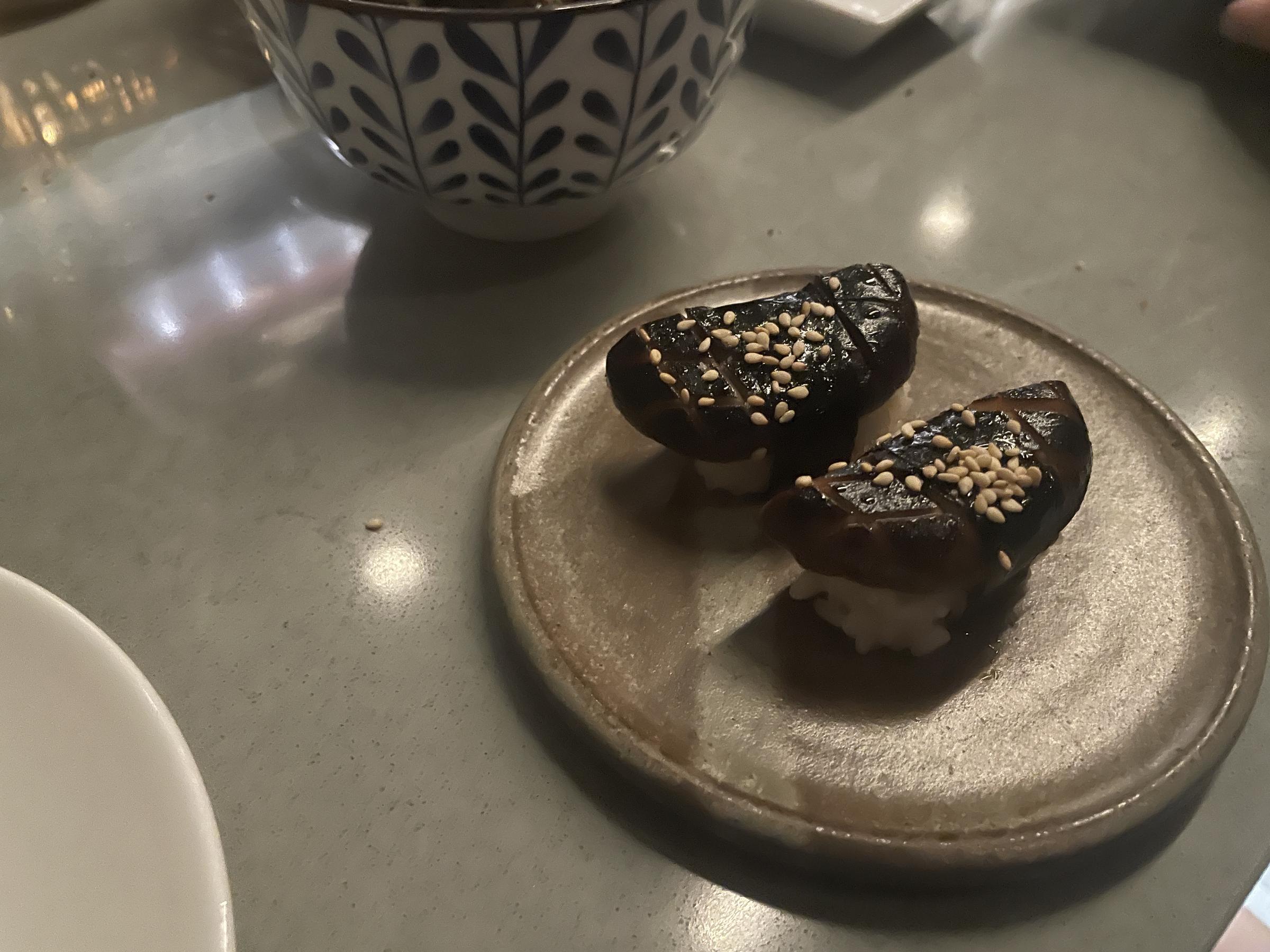 Our final bite came from the sushi chef again. He provided us with a butter-poached mushroom nigiri. He said it is one of the least ordered items, and I would never have thought to order it. The smokey butter flavor came rushing out as soon as you bit into the mushroom. I enjoyed tasting it, but it's probably not worth the order unless you're vegetarian.