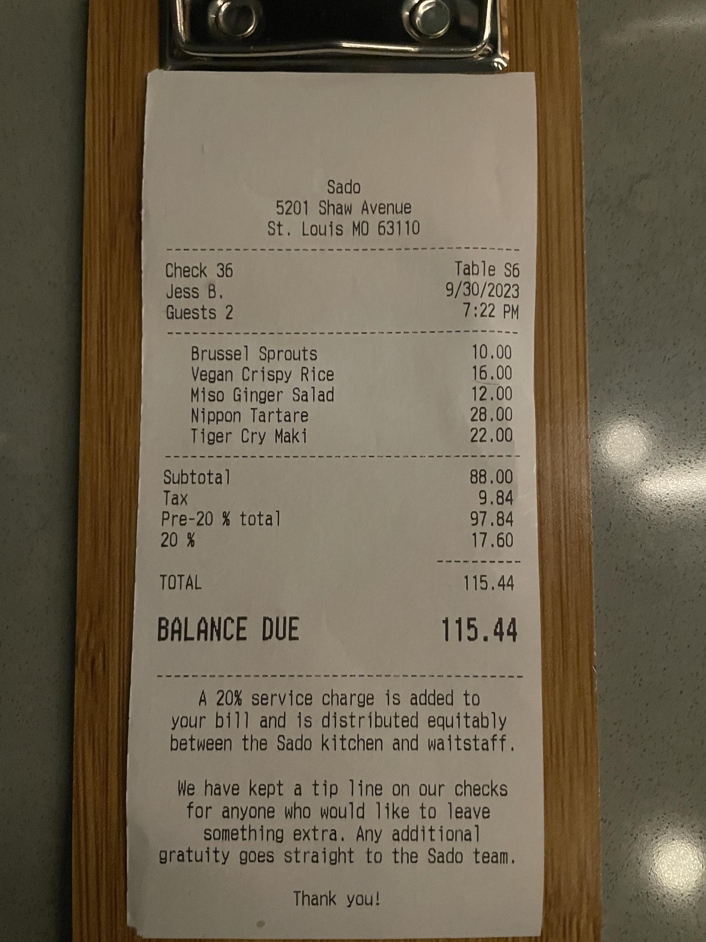 And lastly, it was surprisingly affordable, given the food quality and the atmosphere. The most straightforward comparison because it's fresh of mind is to Akar. Akar was $160 for the two of us, while this meal came in at $115. We went out for ice creams for another $10, so $125, let's say, apples-to-apples comparison. $35 cheaper, and I think if we optimized our order, we'd be all in around $100-$110 with dessert for two people. That makes it 30% cheaper than Akar for the best sushi in St. Louis and one of the top five sushi I've had.