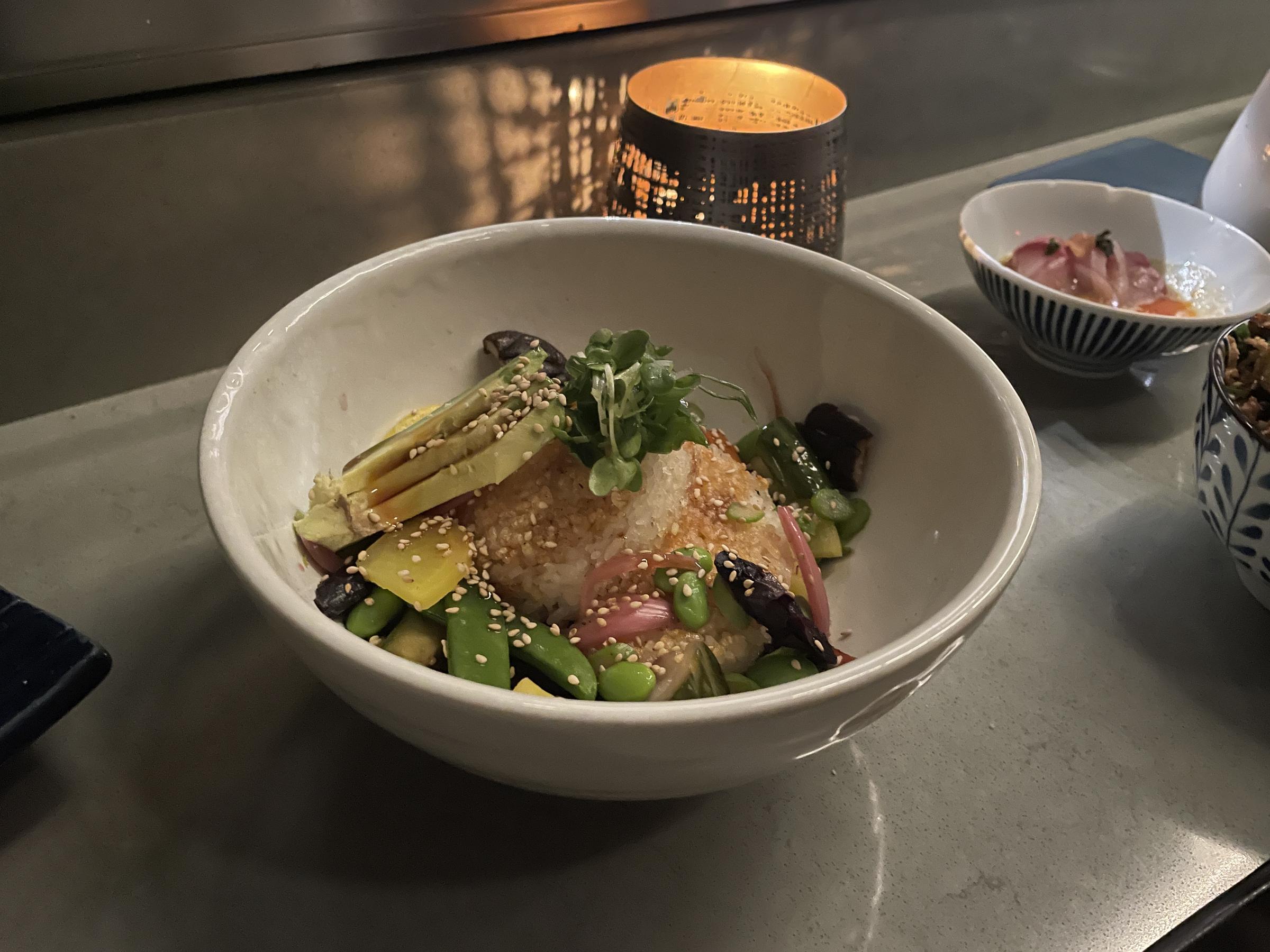 Surprisingly, the vegan crispy rice was my favorite. My wife was the one who ordered that one more for herself, but I ended up taking more than my half because it was so good. It's a fried rice patty with vegetables and sauce on top of it, and the crunch on the patty mixed with the sauce and the vegetables was surprisingly delicious.