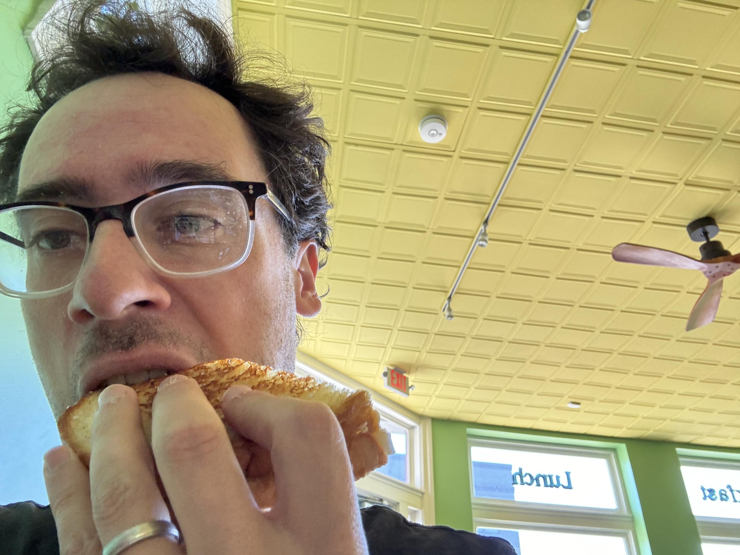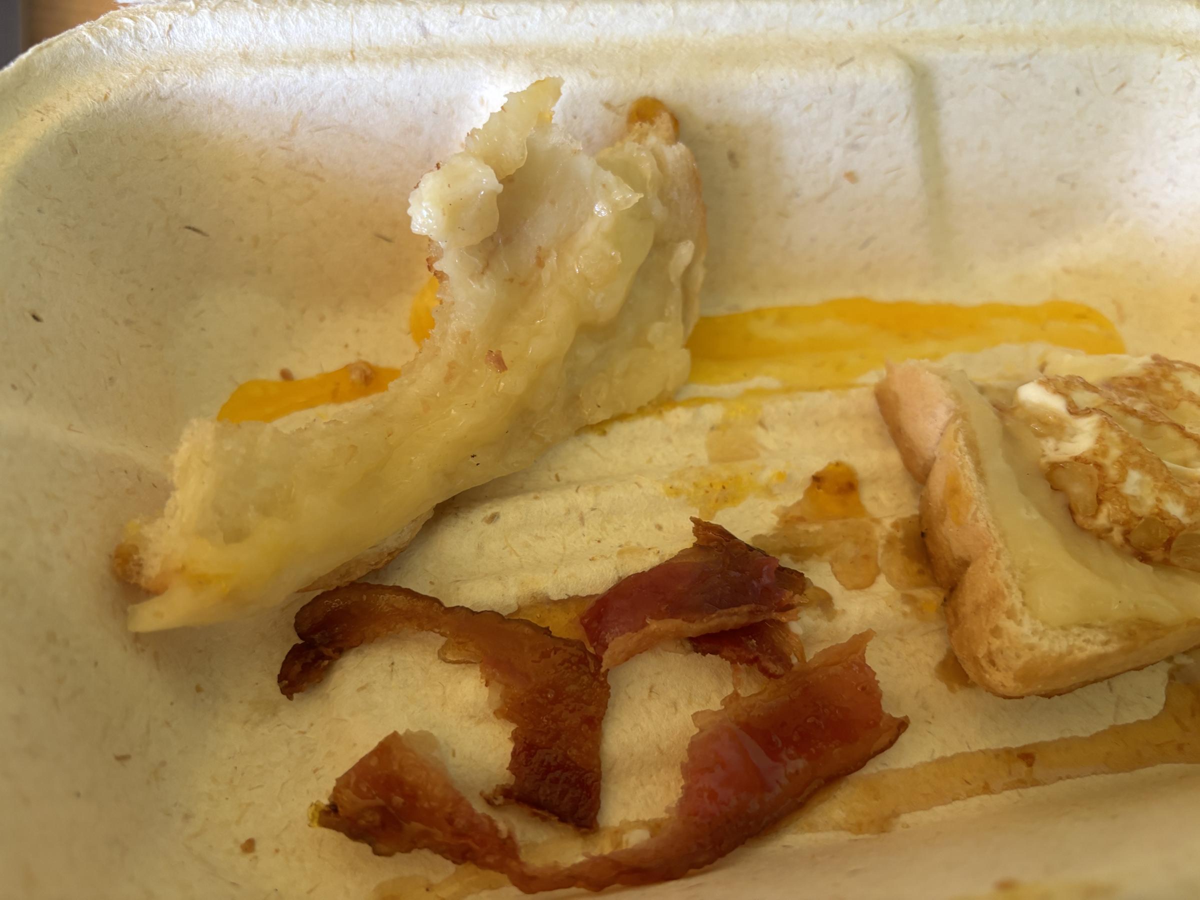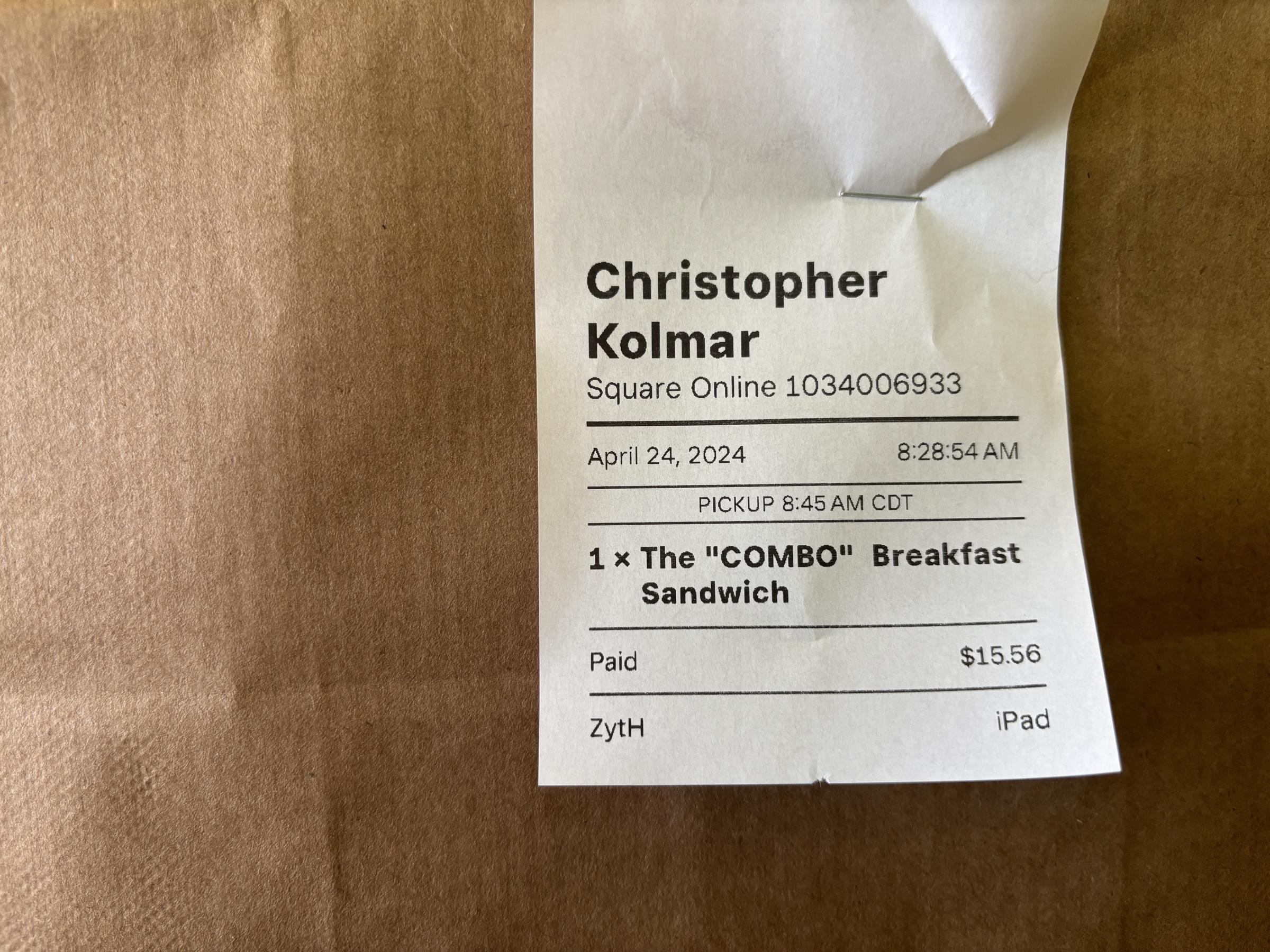 Probably the best breakfast sandwich I've had, the non-taylor ham category. The upper limit on overall taste. Maxes out at like 8.2 / 10. But the $ to-taste value isn't there in my book. The $15.54 all-in for a sandwich this size is high. I could eat two and still be hungry. You can get three bacon, egg, and cheese meals from McDonalds for the same price.