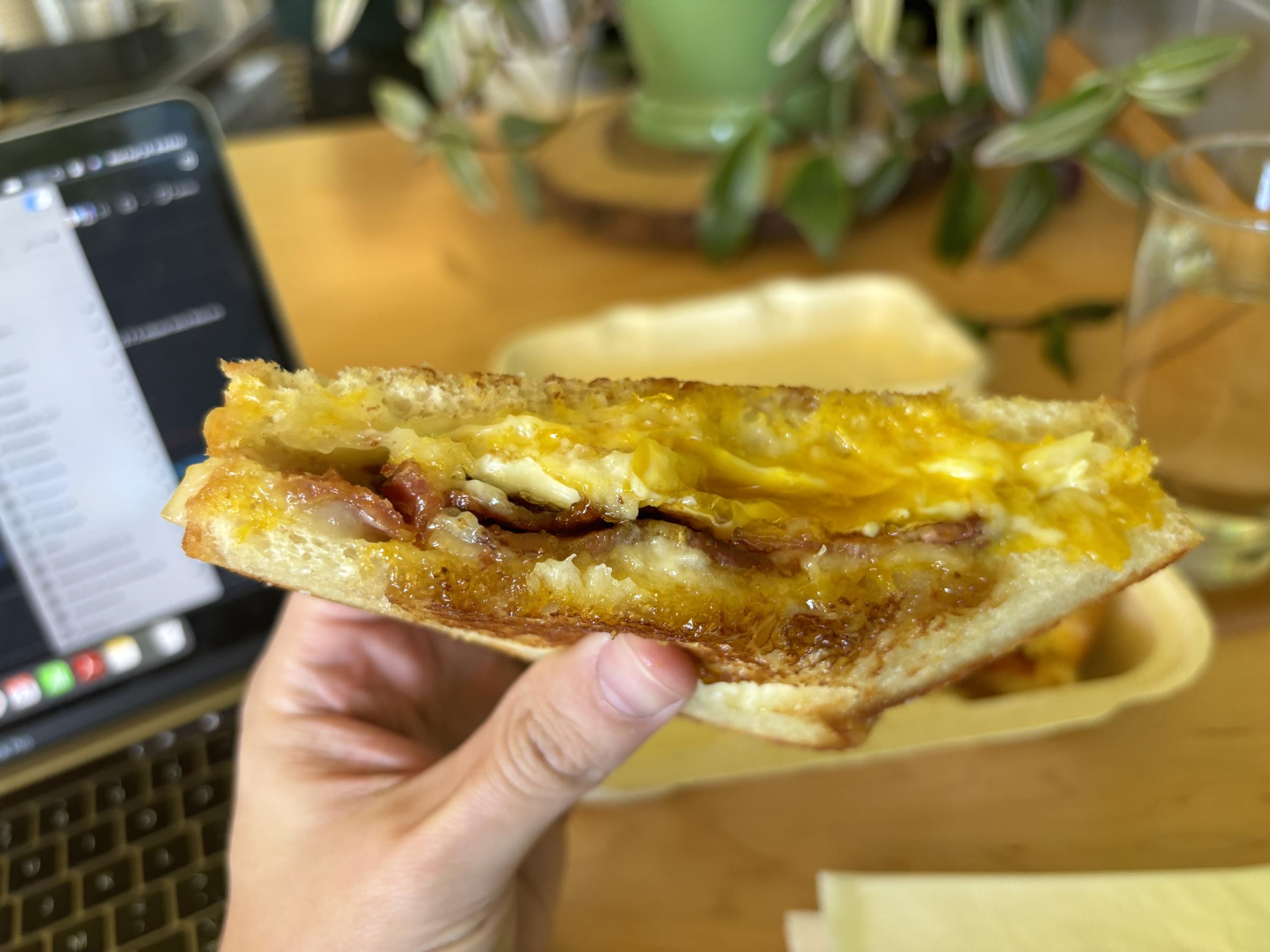 Songbird Takeaway. Your taste buds will sing a song to Sonbird, but your wallet will fall out of the nest. An 8.2 / 10 taste bacon breakfast sandwich costs $13 base, nets out to over $15 with tax and tip. The secret ingredient that'll immediately hit your taste buds is the honey. Trying it at home, they only need to add a little to make a big impact on the taste. All the ingredients, from the bread to the cheese, are top-notch, but a price point of around $8 would make much more sense to me.