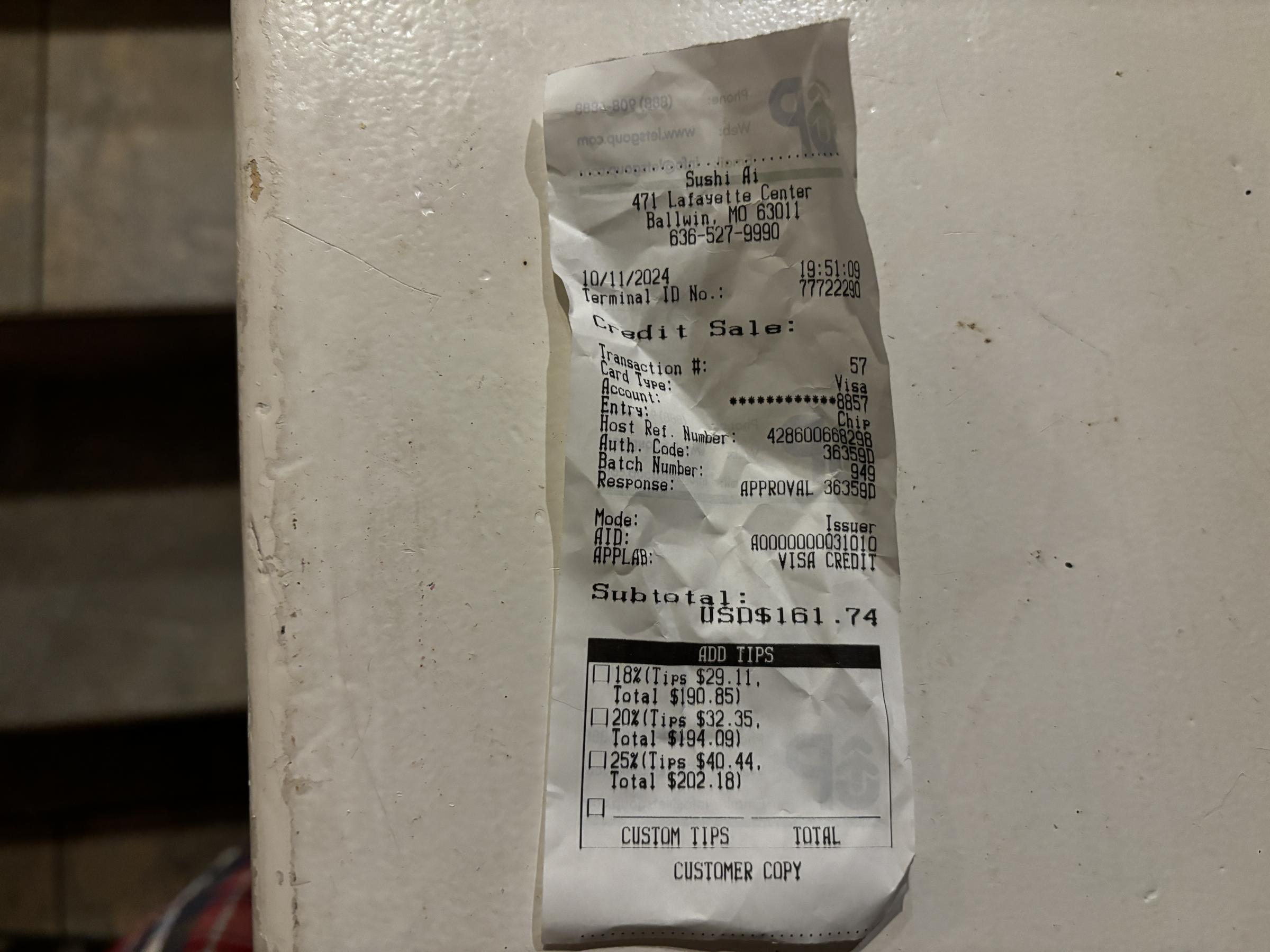 Overall, Sushi AI is a totally fine restaurant--probably a 7 or 7.2 out of 10. The sushi was fresh, and no one got food poisoning, so that's a win. It's the kind of place that's perfectly okay if you're nearby and craving sushi, but not one I'd go out of my way for. It's a good spot for takeout on a Friday or Saturday night if you're in the area.