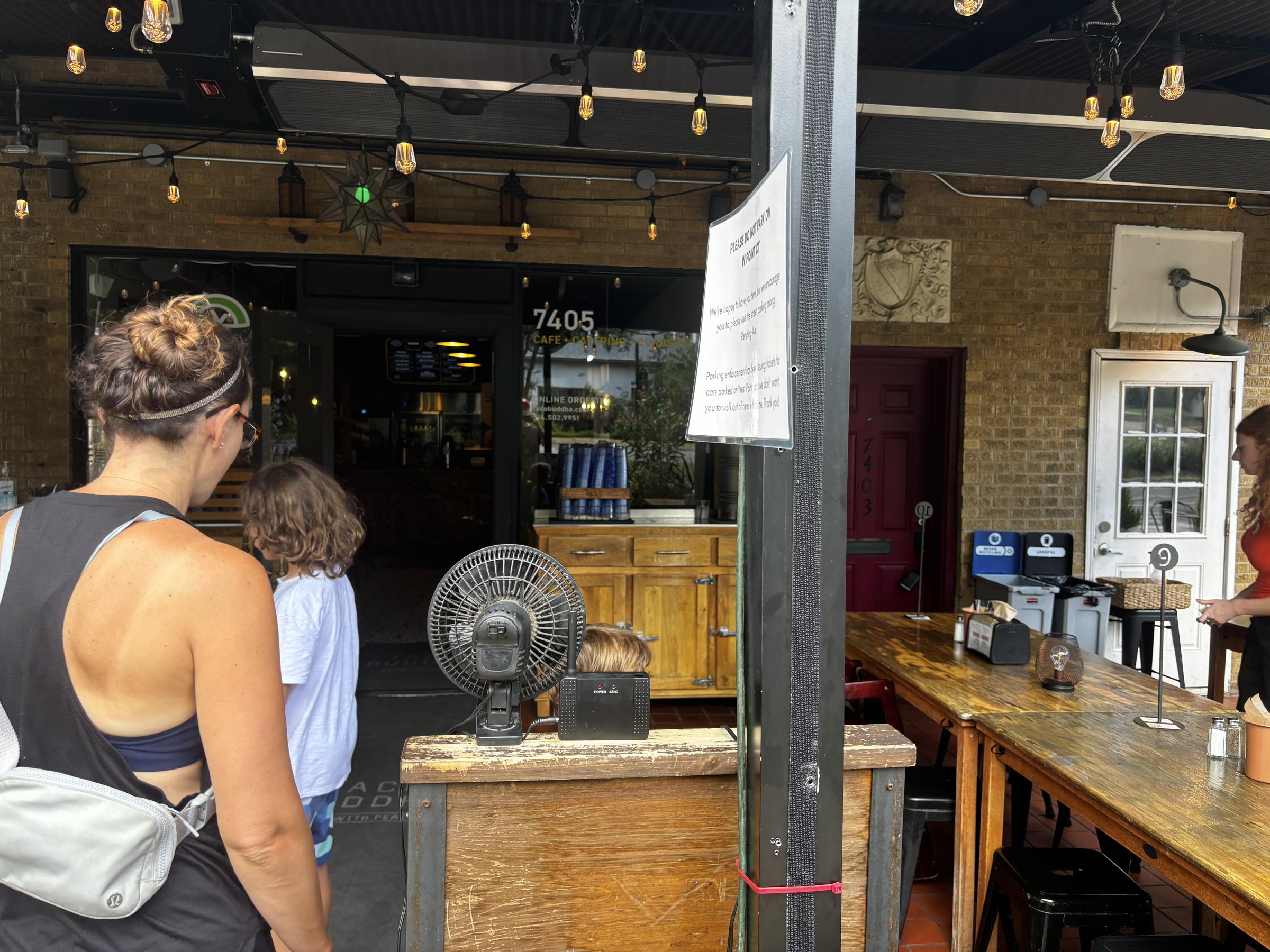 Most of the family-style, big, wood tables are outdoors under fans in summer and heat lamps in winter, with a limited selection of maybe three tables indoors.